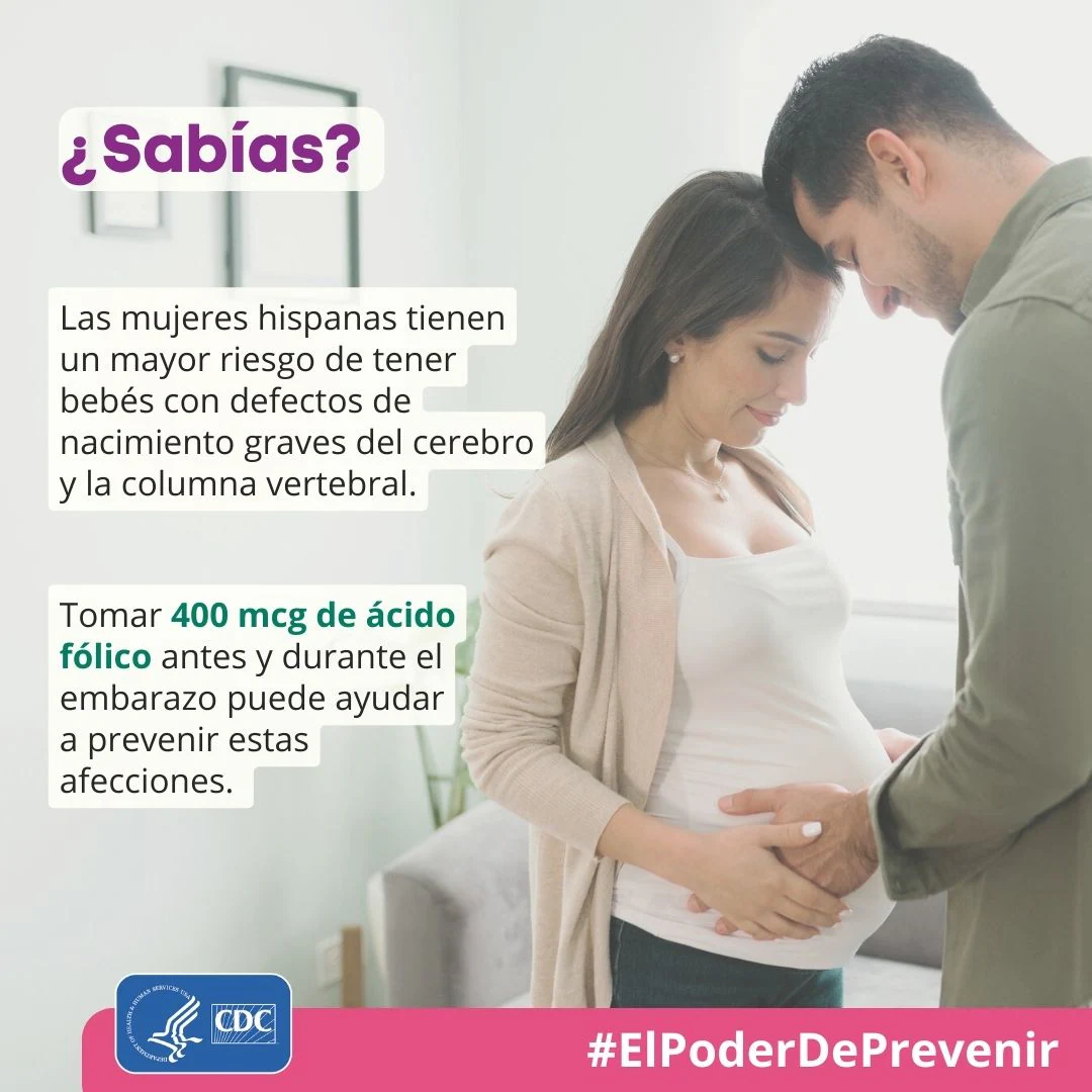 ¡Comenzar una familia es un momento emocionante! Asegúrate de cuidarte a ti misma y a tu futuro bebé obteniendo suficiente ácido fólico. Tomar 400 mcg de ácido fólico cada día antes y durante el embarazo puede ayudar a prevenir graves defectos de nacimiento del cerebro y la columna vertebral. #ÁcidoFólico #ElPoderDePrevenir