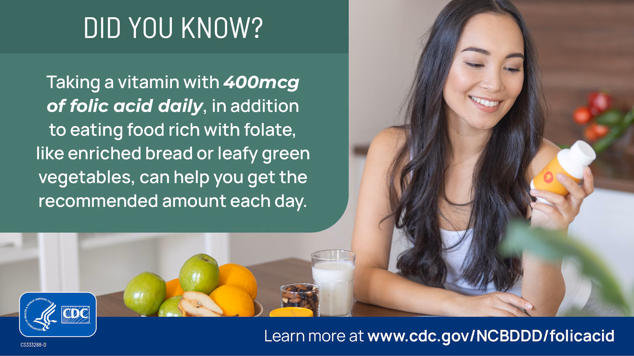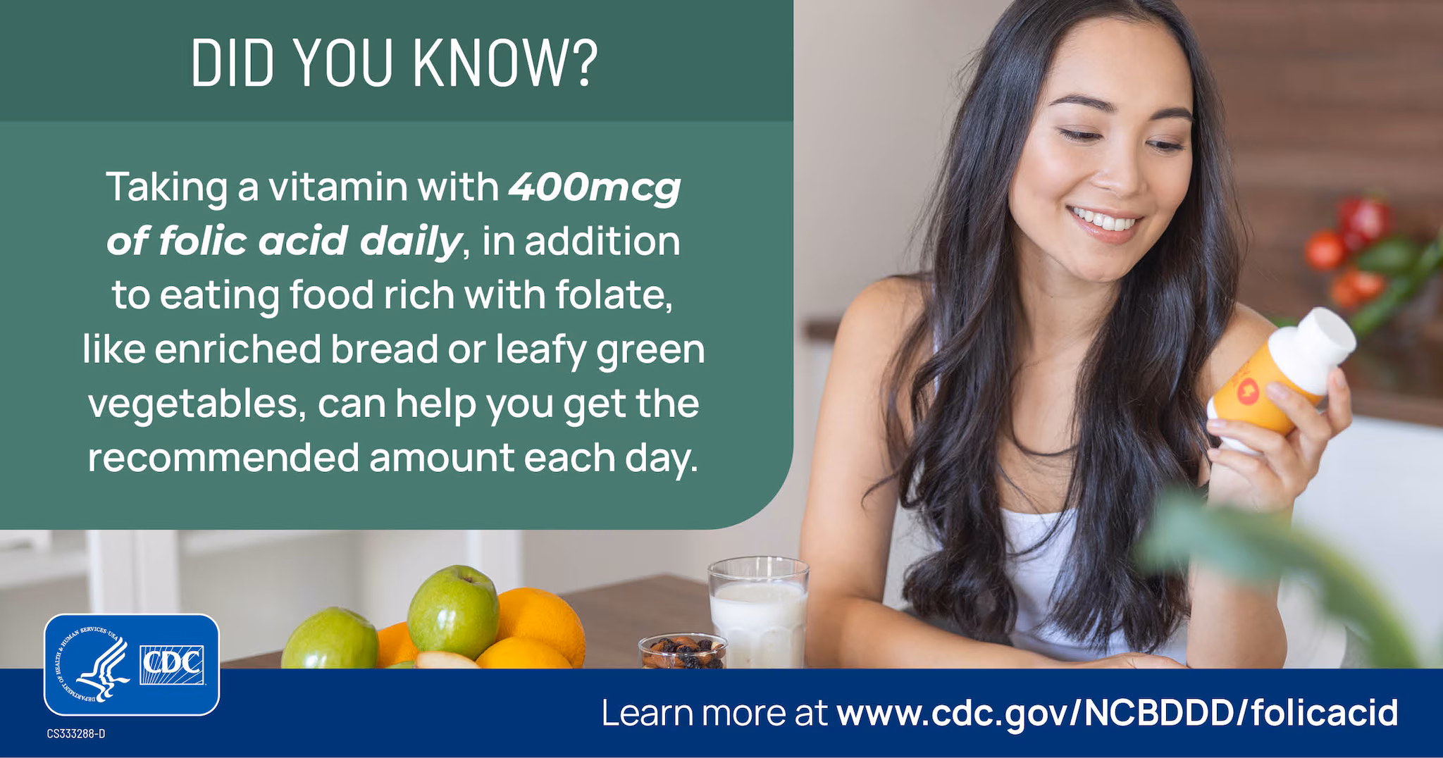 Hispanic/Latina women are more likely to have a child born with a neural tube defect (NTD) than non-Hispanic White and Black women. Getting 400 mcg of folic acid daily before and during early pregnancy can help reduce the risk of NTDs. Use the graphic and sample message on your various platforms to help raise awareness about folic acid among Hispanic/Latina women in your community.