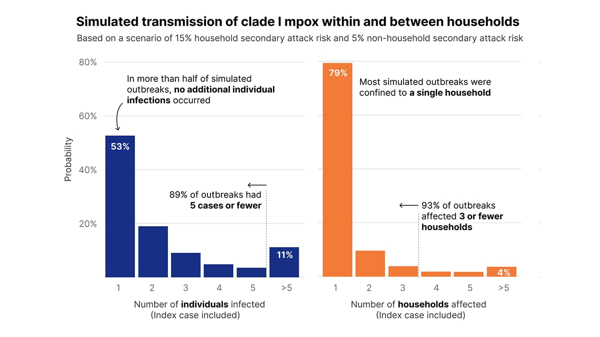 There is an ongoing outbreak of clade I mpox in the Democratic Republic of Congo (DRC), although to date, no clade I cases have been detected in the United States. CDC simulated clade I mpox outbreaks resulting from close-contact transmission within and between households (household clusters) in the United States to better understand the potential impact of this transmission route. Modeling results indicate: