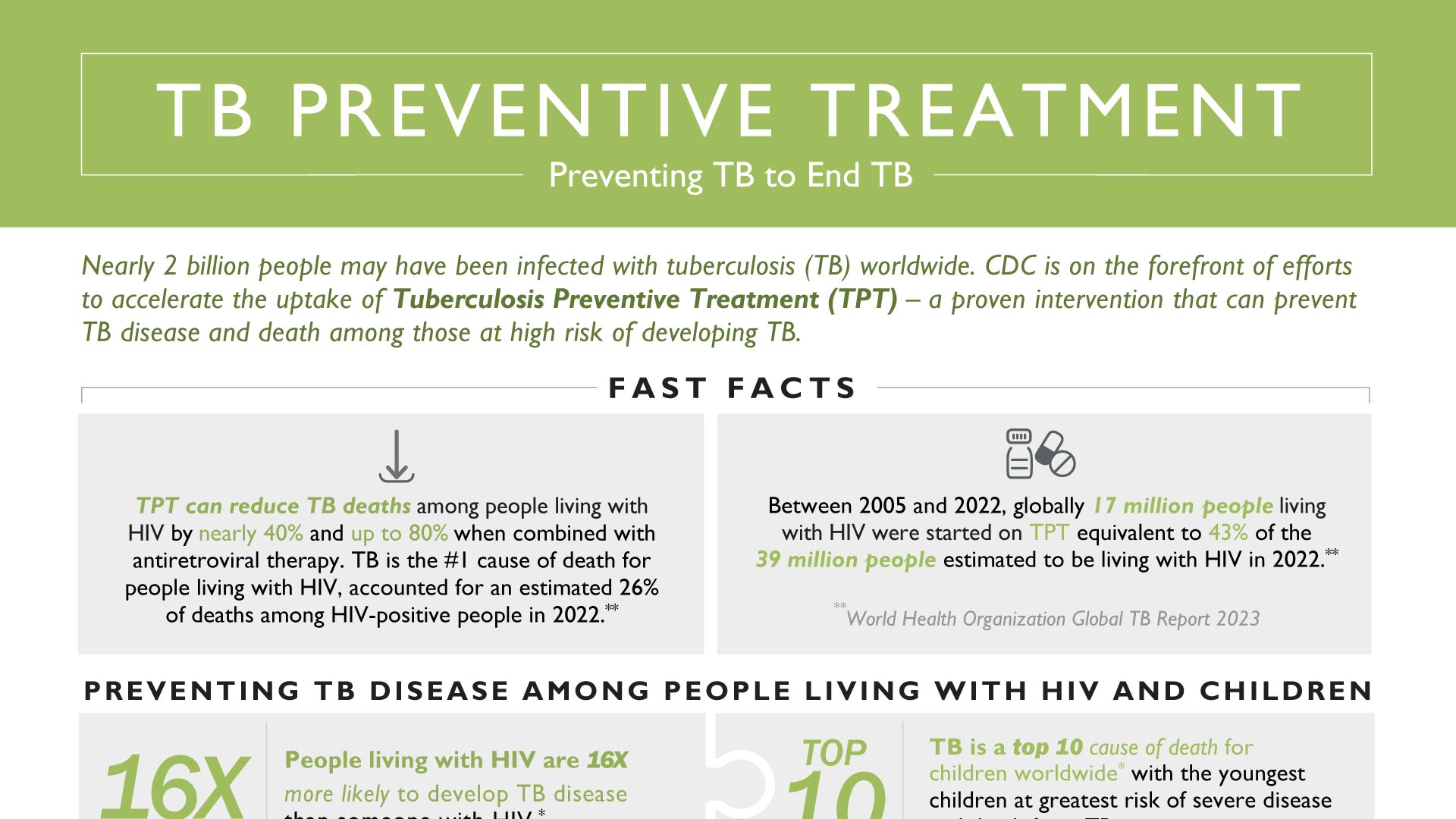 CDC’s Division of Global HIV & TB offers the following resources including: fact sheets, infographics, publications, and videos. This resource collection outlines the global burden of HIV and TB, and CDC’s role in the fight against both HIV and TB.