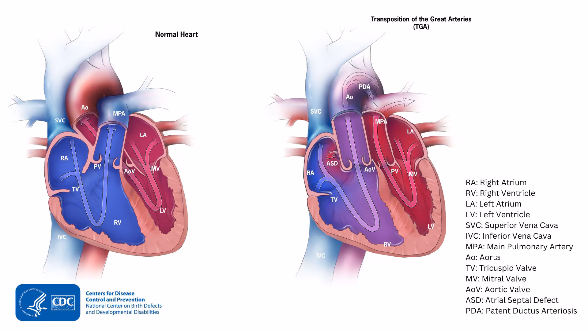 Often, babies with d-TGA have other heart defects, such as a ventricular septal defect (VSD) or an atrial septal defect (ASD). These defects allow blood to mix so that some oxygen-rich blood can be pumped to the rest of the body. The patent ductus arteriosus (labeled PDA in the image) also allows some oxygen-rich blood to be pumped to the rest of the body.