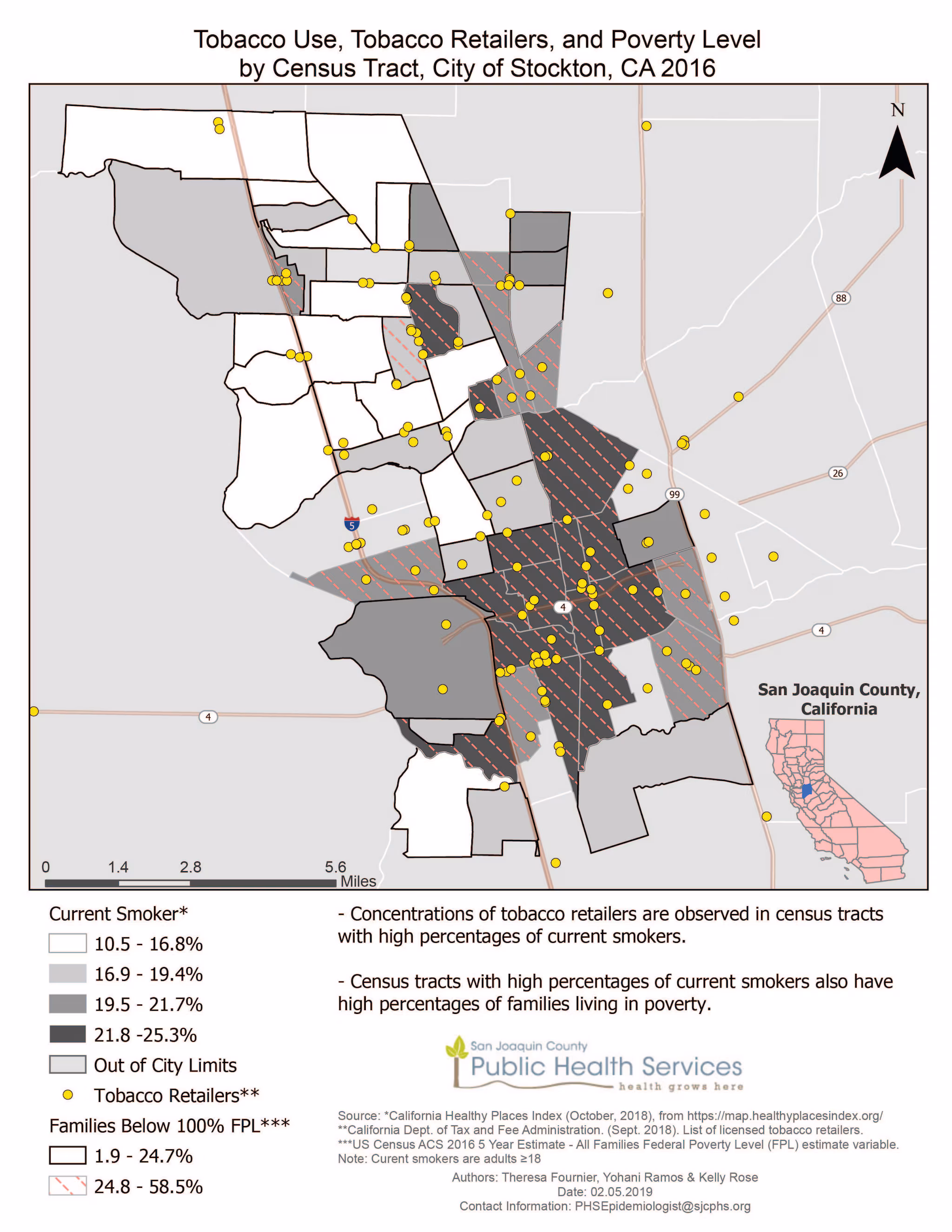 Retrieved current smoker data from the California Healthy Places Index. Tobacco retailer locations were retrieved from the California Board of Equalization. For poverty data, we used U.S. Census data, and classified the data using the natural breaks method with two classes.