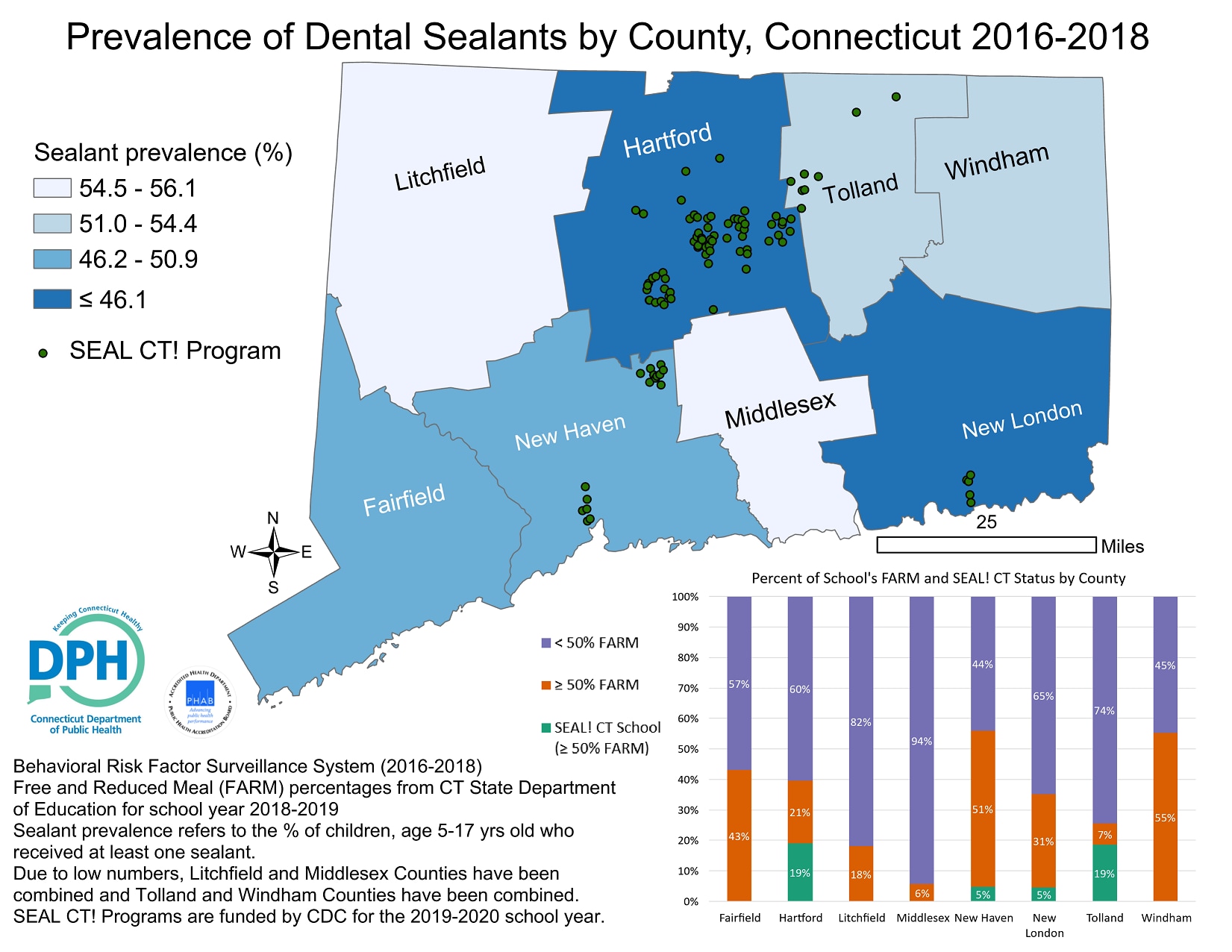 Dental sealants are a well-accepted clinical intervention to prevent tooth decay. School-age children (ages 6-11) without dental sealants have almost 3 times more cavities in their first molars than those with dental sealants. Children from families with low incomes experience a higher incidence of dental caries than their higher-income counterparts. Hartford county, one of the counties with the lowest sealant prevalence, has been the focus of the school sealant program funded through CDC for the 2019/2020 school year. It is hopeful that this will improve the sealant prevalence in the future.