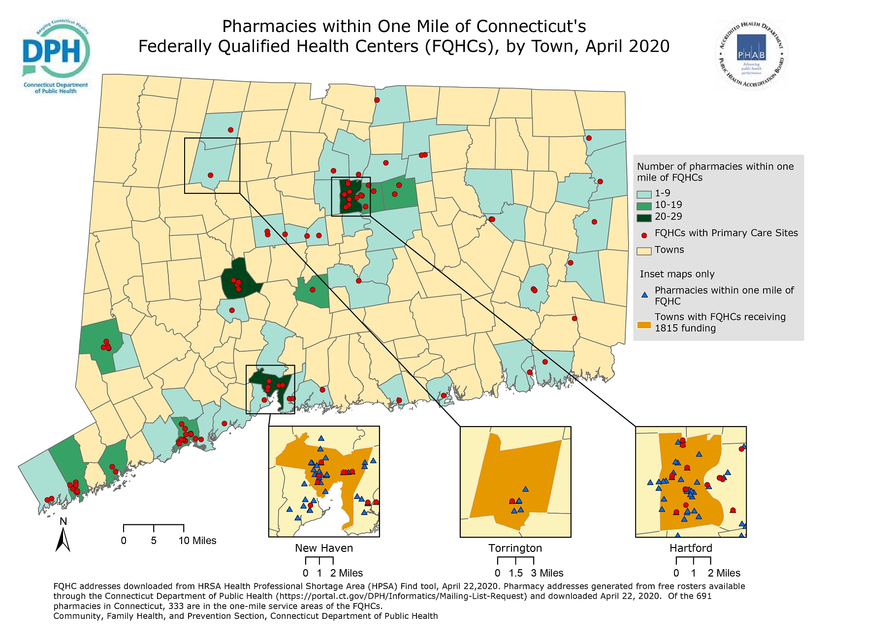 FQHC addresses were downloaded from the Health Resources and Services Administration (HRSA) Health Professional Shortage Area (HPSA) Find Tool on April 22, 2020. Pharmacy addresses were generated from free rosters available through the Connecticut Department of Public Health (https://portal.ct.gov/DPH/Informatics/Mailing-List-Request) and downloaded on April 22, 2020. The 2018 road network dataset used was created by the Children’s Environmental Health Initiative (CEHI) from the publicly available TIGER/Line roads for the Connecticut area. Pharmacy addresses were geocoded using a geocoder built by CEHI and is based on 2018 TIGER/Line road data published by the US Census.