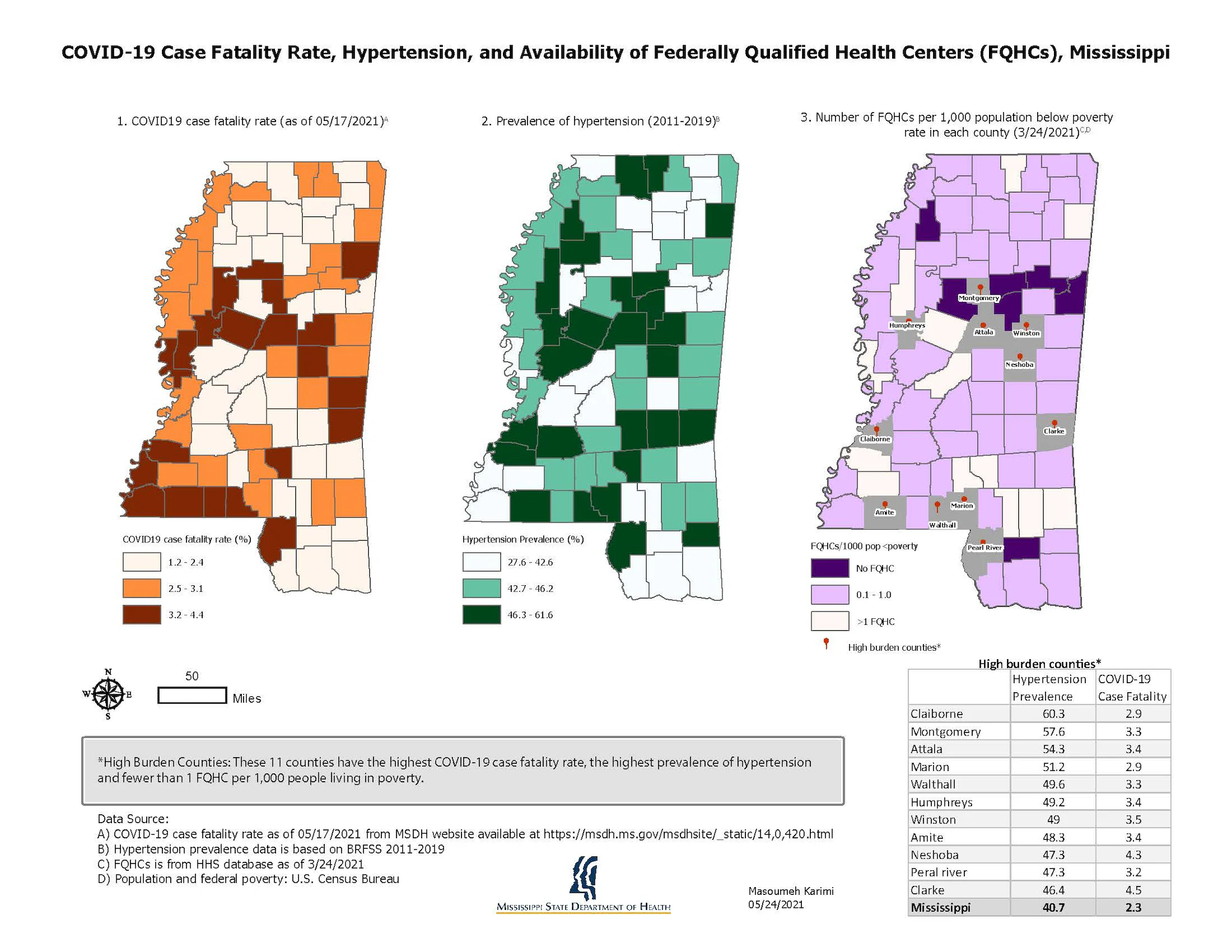 There are 11 counties that have the highest case fatality rates of COVID-19, the highest prevalence of hypertension and less than 1 FQHC per 1,000 population below the federal poverty level. This is 13% of Mississippi counties.