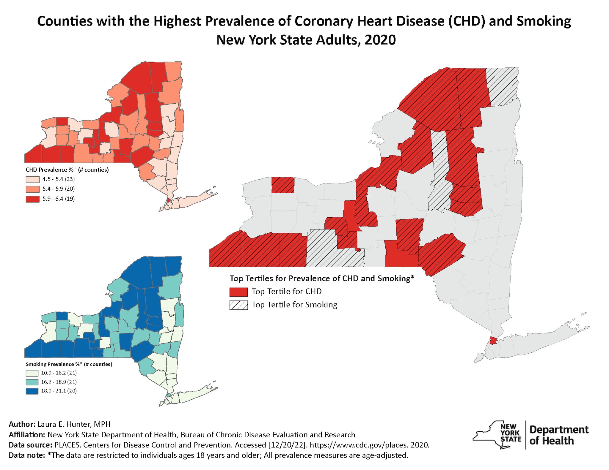 This map is targeted towards New York State Health Department (NYSDOH) officials, community partners, and supporting agencies across the state working towards the goal of reducing tobacco use, along with the prevention and mitigation of smoking-related cardiovascular disease. Specific agencies and partners will use the maps include the New York State Department of Health's Bureau of Chronic Disease Evaluation and Research (BCDER), Bureau of Tobacco Control (BTC), Bureau of Community Chronic Disease Prevention, along with numerous grantee partners of the respective state agencies. These maps identify dual high-burden areas across the state that may benefit from tailored interventions to reduce risk. This map will further be used by NYSDOH and key partners to help understand and visualize the variations in both smoking rates and related cardiovascular health outcomes across the state. These visualizations of the patterns for CHD and smoking across the state highlights the need to understand the factors contributing to high rates for both outcomes in certain regions.