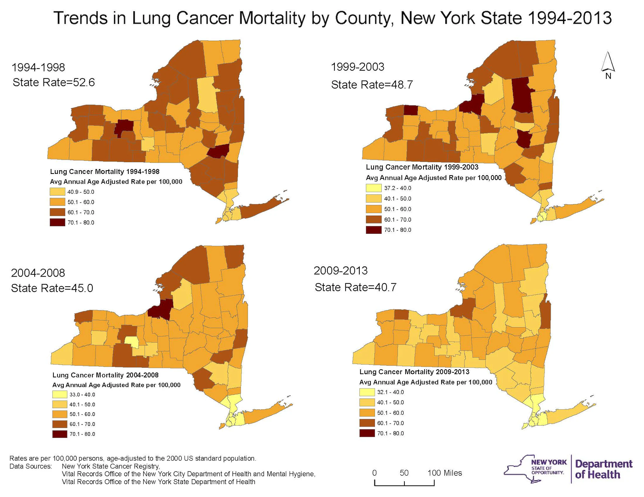 Juster, T., "Trends in Lung Cancer Mortality by County, New York State 1994-2013" [map]. July 2017. New York State Department of Health. Accessed from the Centers for Disease Control and Prevention's Chronic Disease Map Gallery.