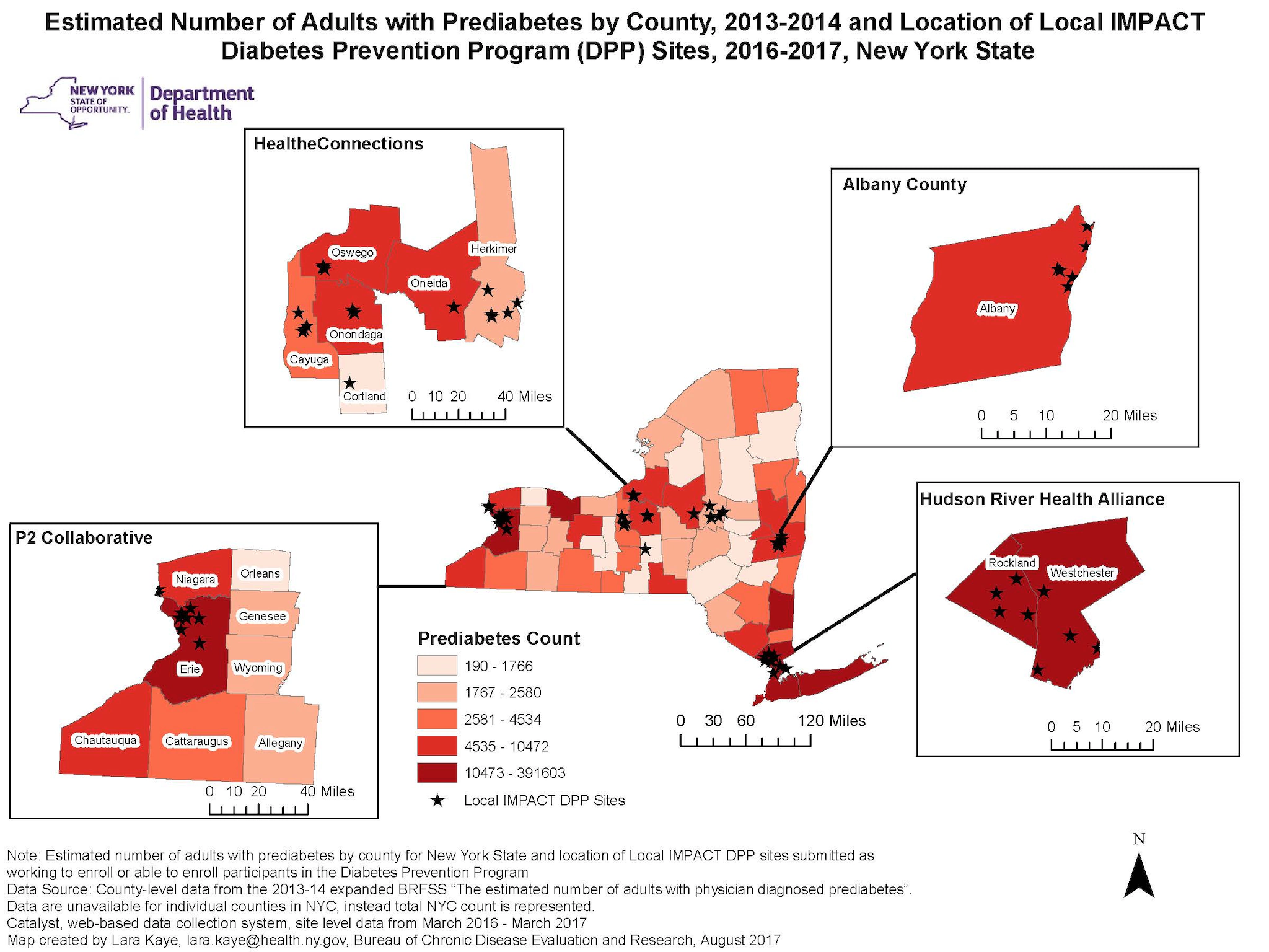 Kaye, L. "Adults with Prediabetes by County and Local IMPACT DPP Sites [map]. September 2017. Bureau of Chronic Disease Evaluation and Research, New York State Department of Health. Accessed from the Centers for Disease Control and Prevention's Chronic Disease Map Gallery.
