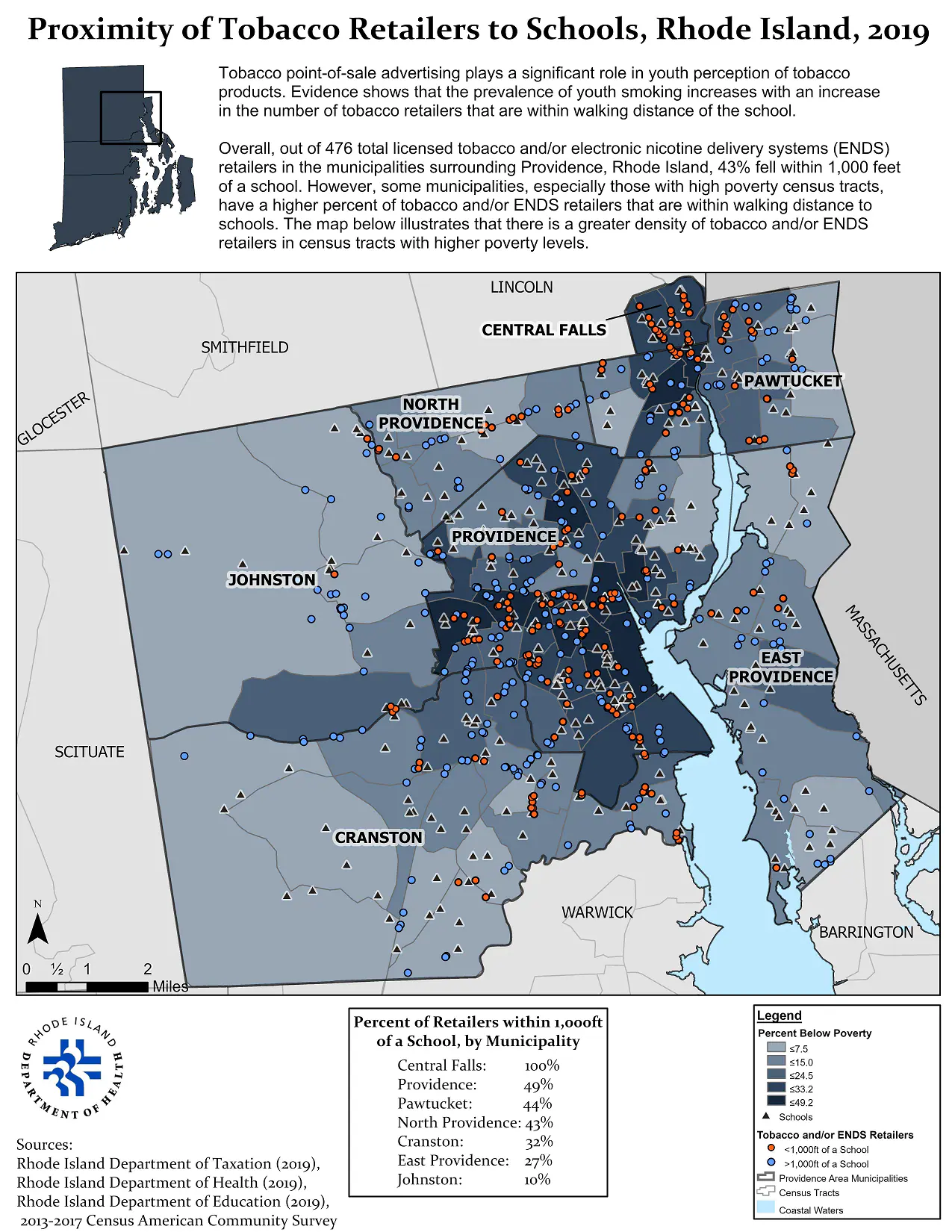 Providence-area municipalities with the highest proportion of adults below poverty (Central Falls, Providence, and Pawtucket) also have the highest proportion of tobacco and/or ENDS retailers that are within walking distance from a school.