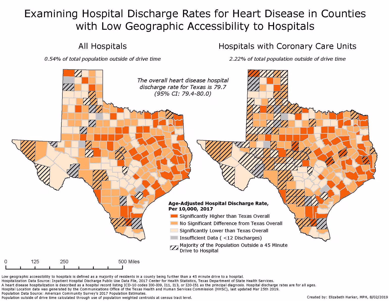 Age-adjusted heart disease hospitalization discharge rates with 95% confidence intervals (CI) were calculated using SAS, version 9.4, for each county and the state overall. The 95% CIs were used to determine if a county’s discharge rate was, statistically, significantly different from that of the state overall. A service area analysis was performed in order to determine the area encompassed within a 45-minute drive of a hospital. This analysis was done twice: first with all hospitals and second with only hospitals listed as having a coronary care unit. Populations were estimated using population weighted centroids calculated to the census tract level. The percent of the population in each county outside of the drive time was then calculated. The total of the Texas population outside of the drive time was also calculated using the population weighted centroids.