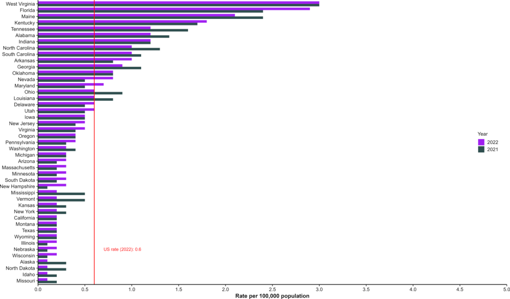 Only states with rates for 2021 and 2022 are shown. State/jurisdiction and year for no reported cases: Connecticut (2022, 2021), Hawaii (2022, 2021), New Mexico (2022).