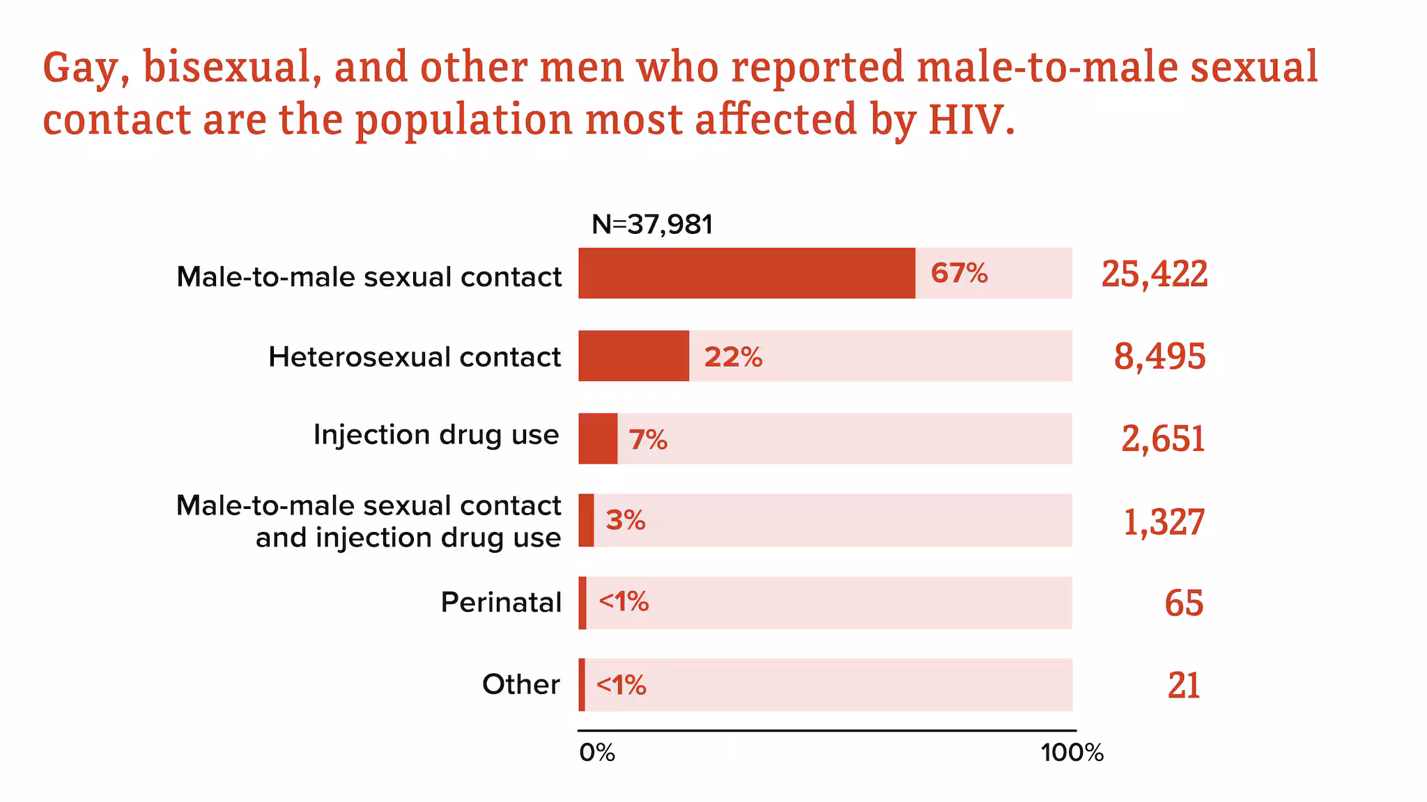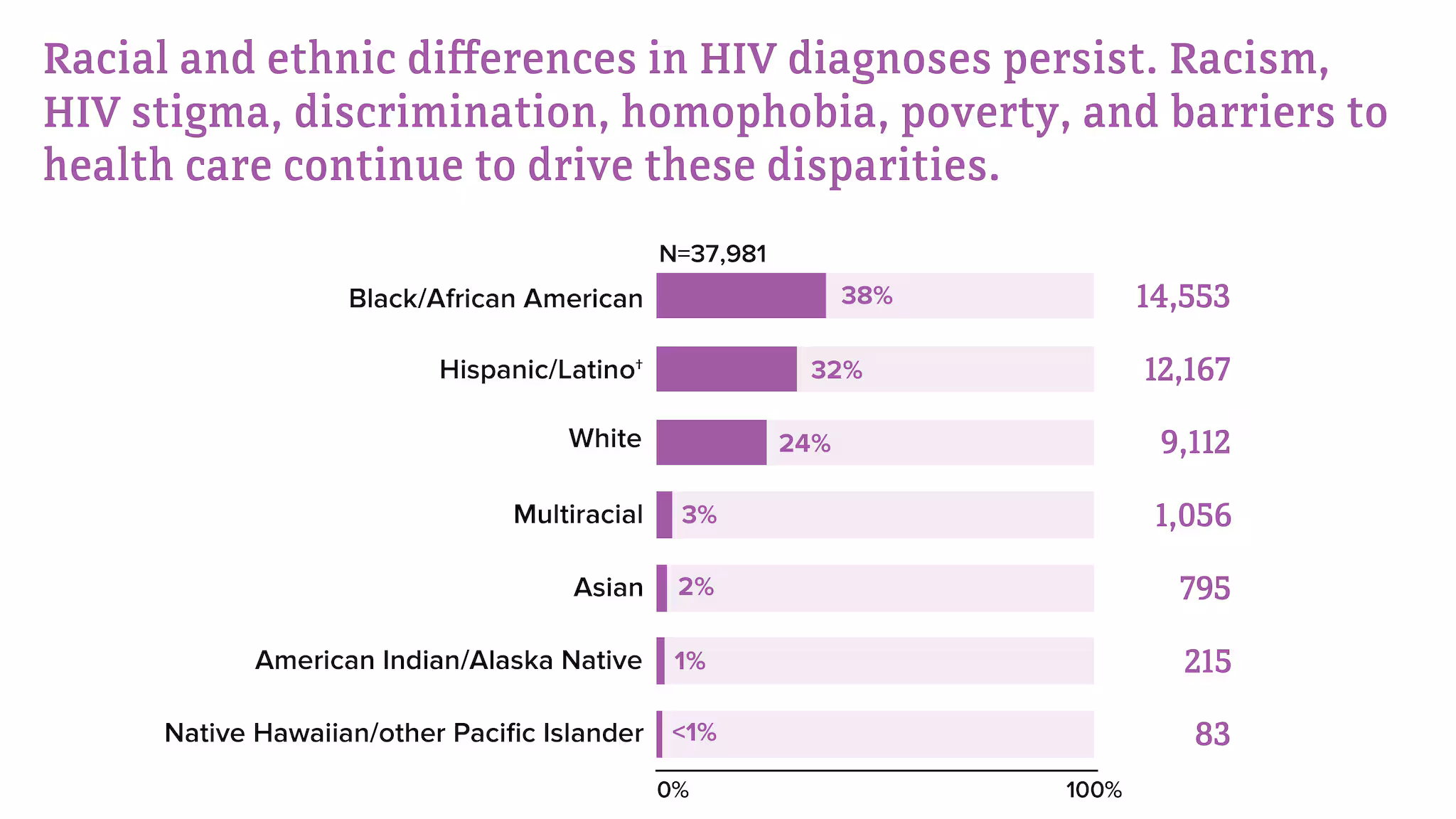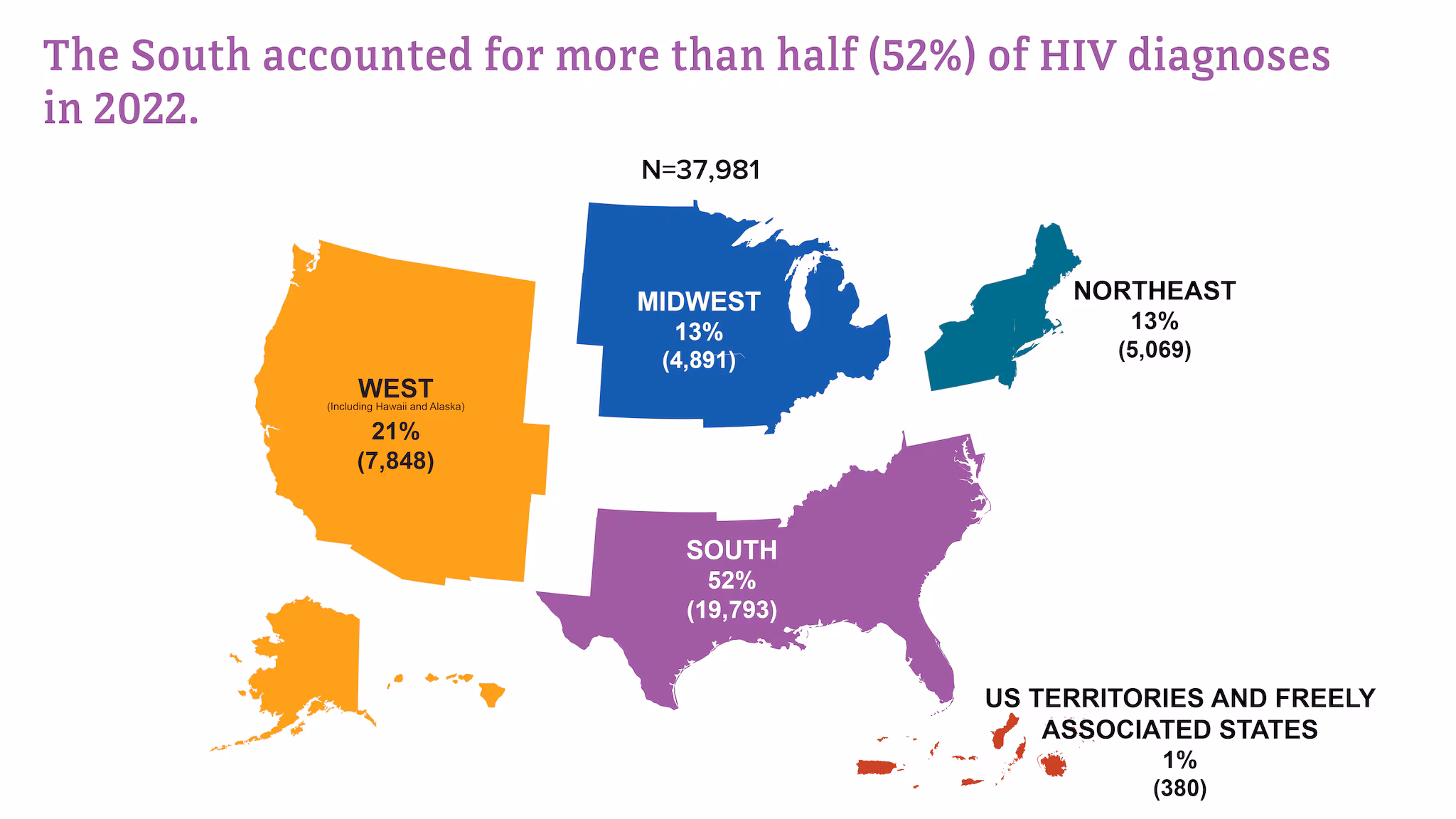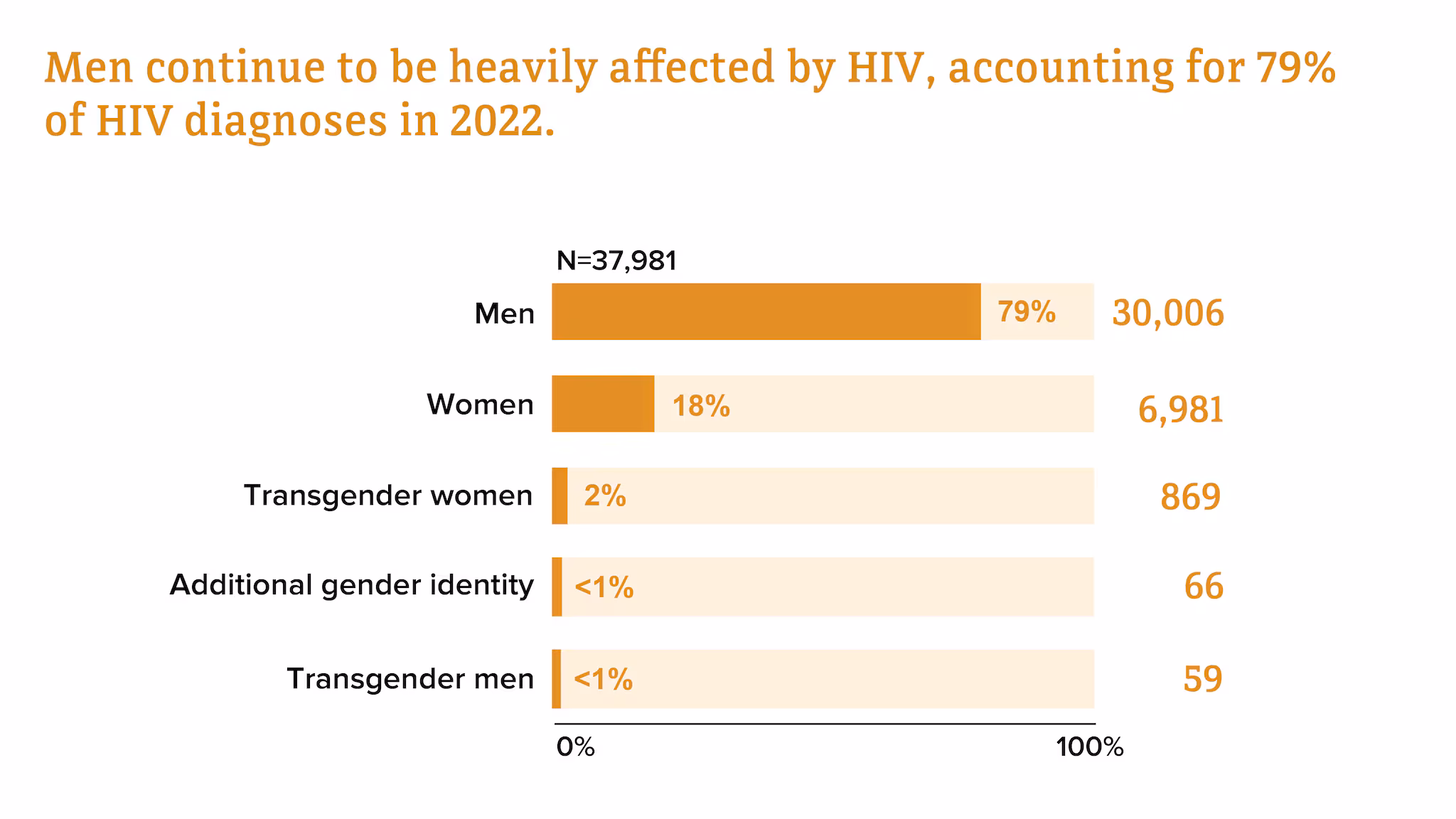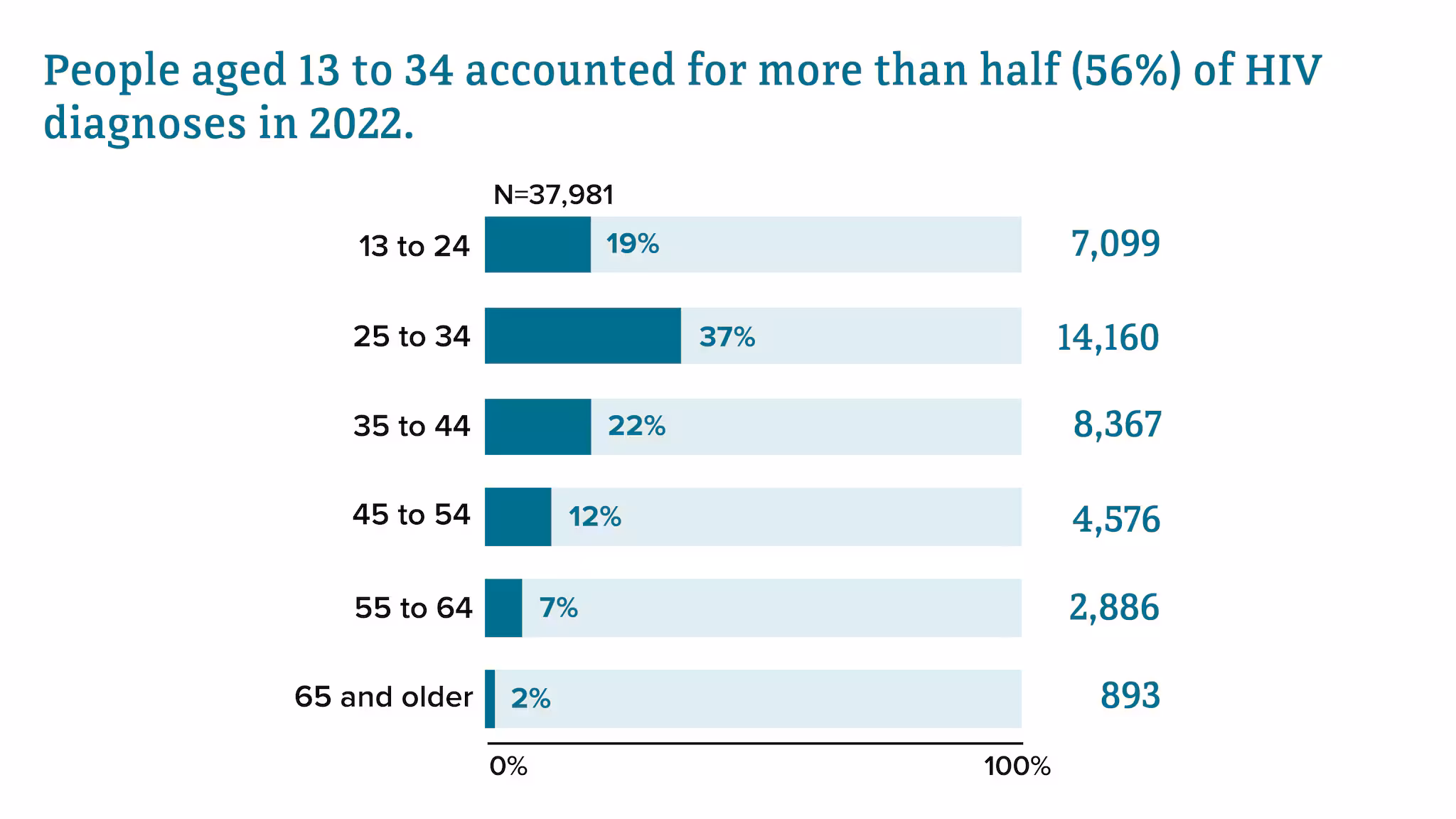 In 2022, over 38,000 people received an HIV diagnosis. Men are most affected, making up almost 80% of diagnoses, with gay and bisexual men accounting for the majority. Racial disparities remain a concern, as Black/African American people make up 38% of diagnoses. Young people are also affected, with over half (56%) of diagnoses occurring among those aged 13 to 34. Geographically, the South continues to account for more than half (52%) of all diagnoses.