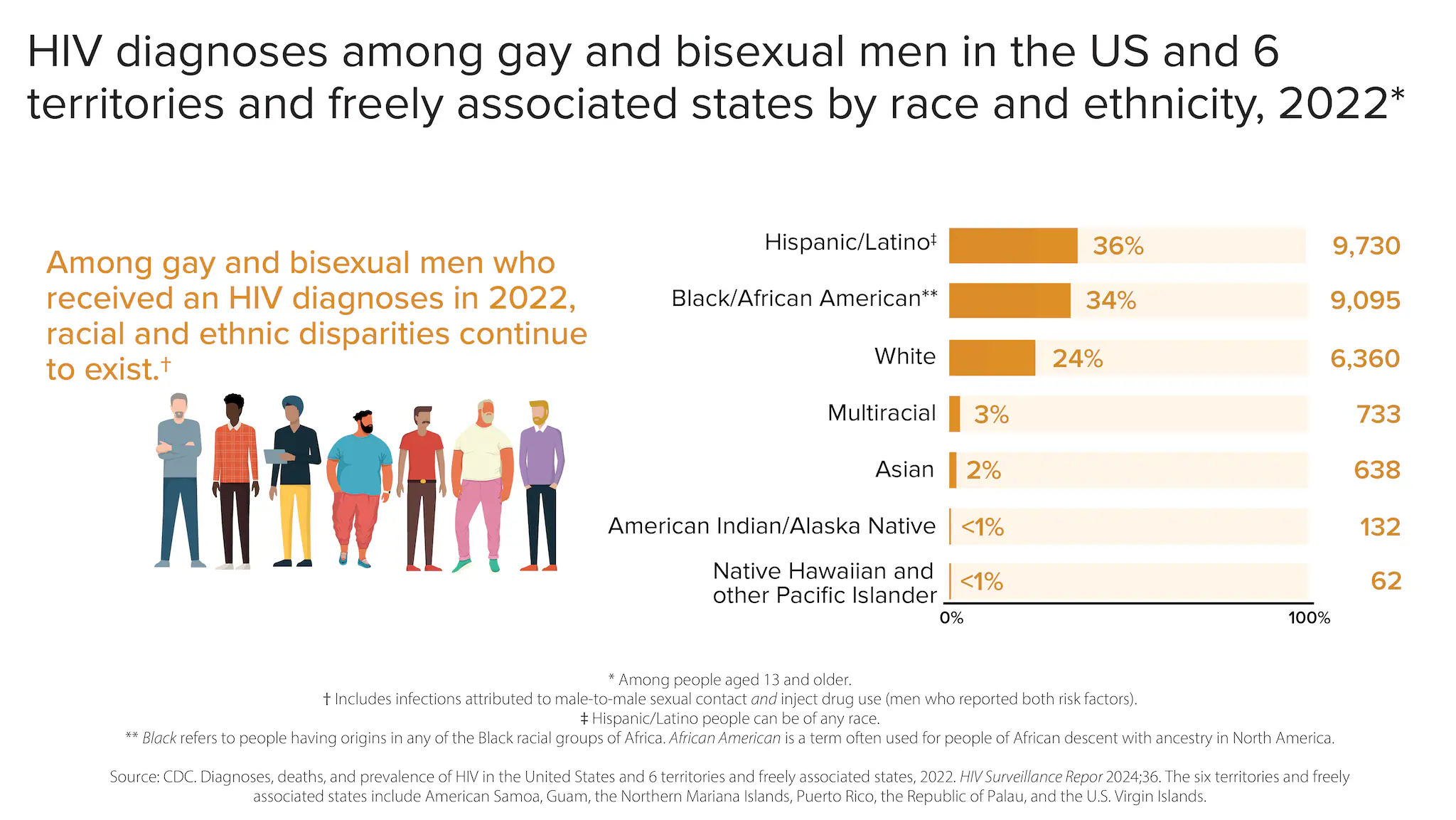 Among gay and bisexual men who received an HIV diagnosis in 2022, racial and ethnic disparities continue to exist.†