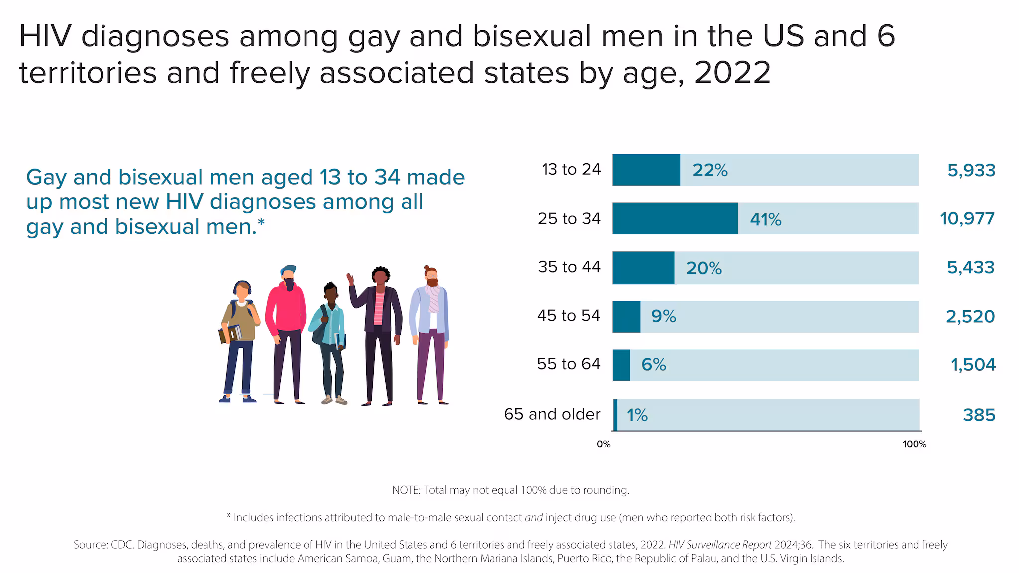 Of the 37,981 people who received an HIV diagnosis in the US and 6 territories and freely associated states in 2022, 70% (26,749) were among gay and bisexual men.†