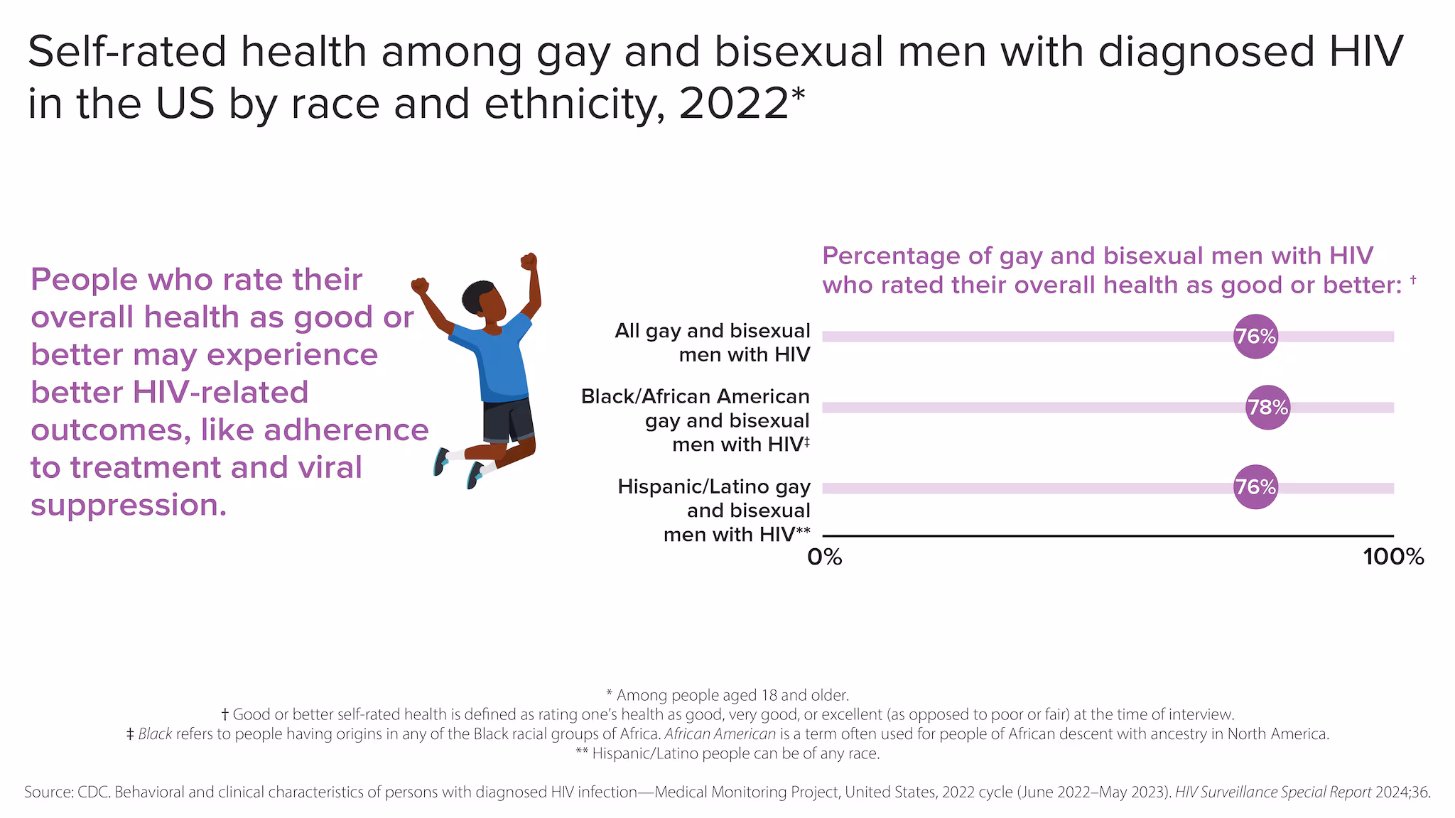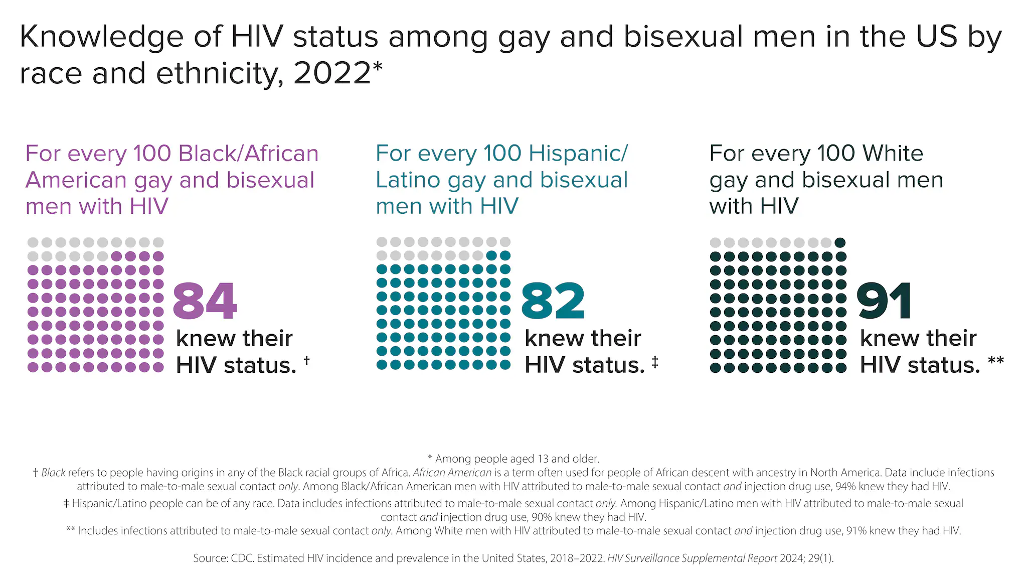In 2022, an estimated 1.2 million people had HIV. Of those, 739,200 were gay and bisexual men. For every 100 people with HIV, 87 knew their HIV status.