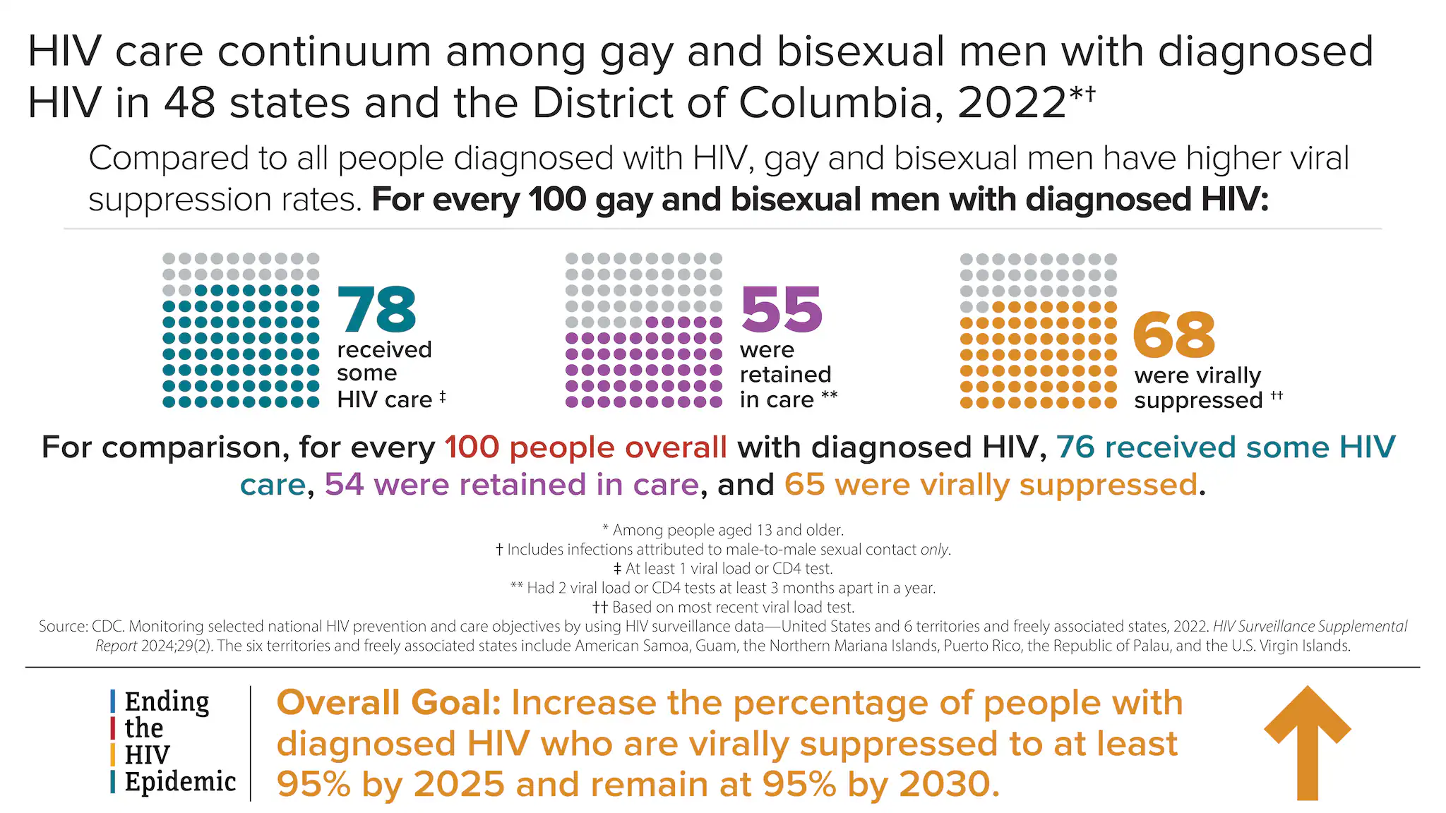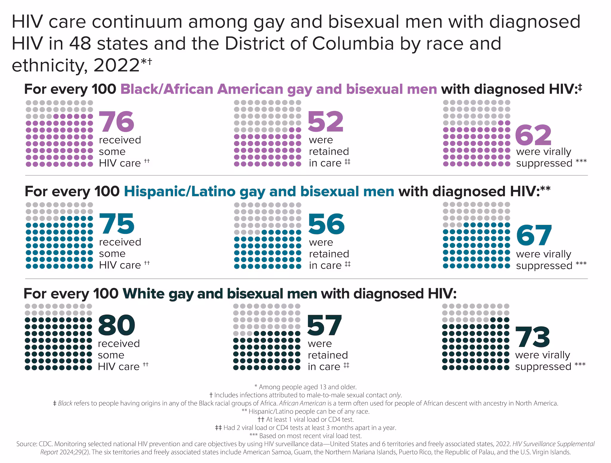HIV care continuum among gay and bisexual men with diagnosed HIV in 48 states and the District of Columbia, 2022*†Compared to all people diagnosed with HIV, gay and bisexual men have higher viral suppression rates. For every 100 gay and bisexual men with diagnosed HIV: