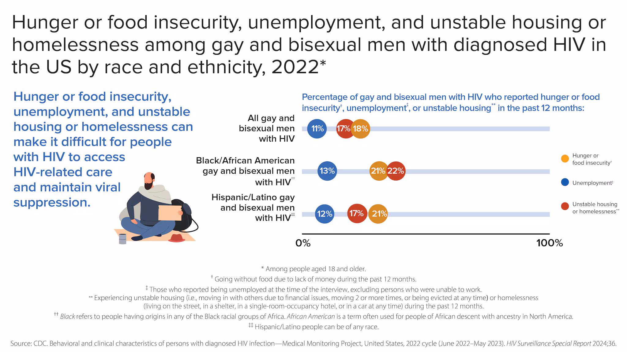 Gay, bisexual, and other men who reported male-to-male sexual contact are disproportionately affected by HIV. Social and structural issues—such as HIV stigma, homophobia, discrimination, poverty, and limited access to high-quality health care—influence health outcomes and continue to drive inequities. Addressing these barriers and encouraging safe and supportive communities can help improve health outcomes for gay and bisexual men.