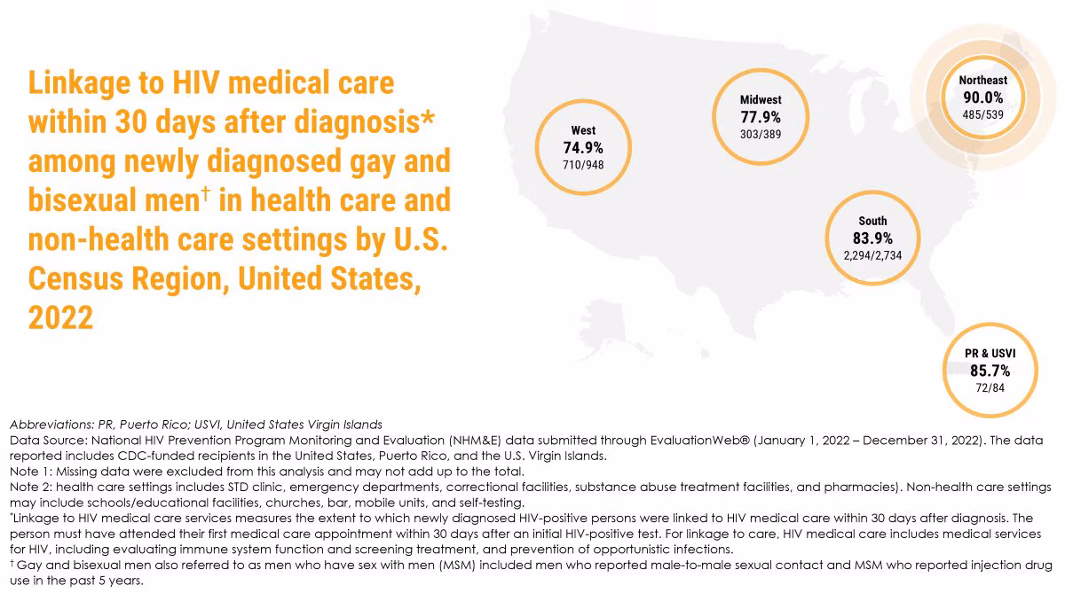 Linkage to HIV medical care within 30 days after diagnosis* among newly diagnosed gay and bisexual men† in health care and non-health care settings by U.S. Census Region, United States, 2022