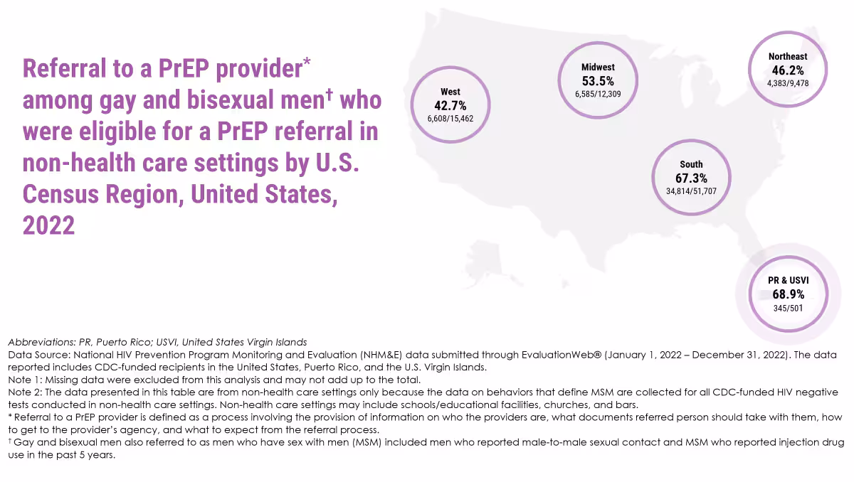 Referral to a PrEP provider* among gay and bisexual men† who were eligible for a PrEP referral in non-health care settings by U.S. Census Region, United States, 2022