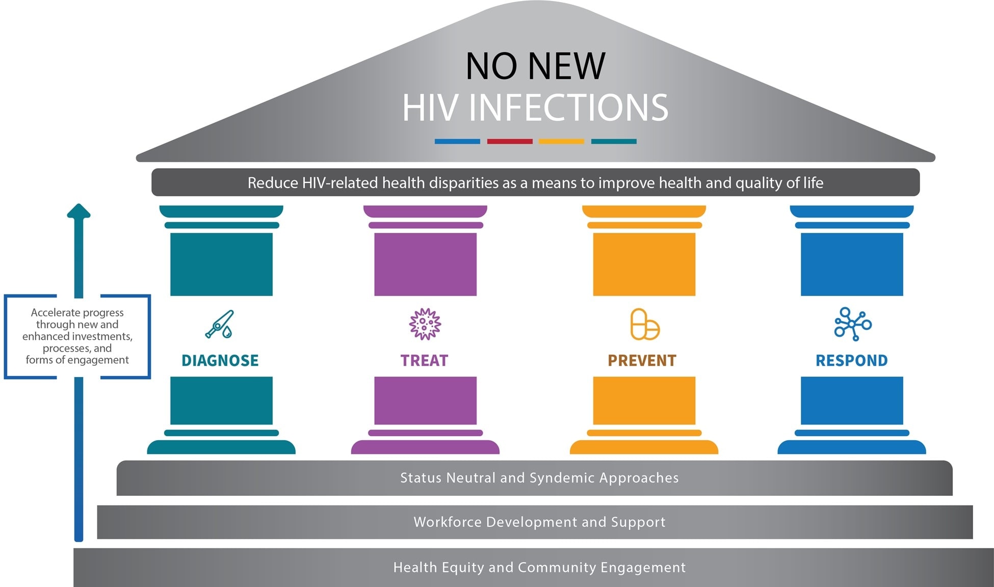 With a foundation built on health equity, community engagement, and workforce development, the syndemic and status neutral approaches guide how health departments, CBOs, and other partners can diagnose, treat, prevent, and respond to HIV. The implementation of these two approaches is enabled by a workforce that is equipped with the resources and knowledge to deliver culturally responsive and inclusive support. The status neutral and syndemic approaches address the unique needs of individuals, including prevention and care for syndemic conditions, regardless of HIV status. Thus, these approaches effectively bridge the divide between prevention and treatment services, help to mitigate stigma, and provide whole-person care.