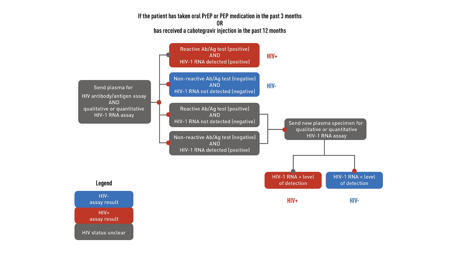 - If the viral load is below the level of detection of the assay for the second blood specimen, and the patient has no signs or symptoms, the first HIV-1 RNA test result was a false positive. The patient does not have HIV, and PrEP can be started.