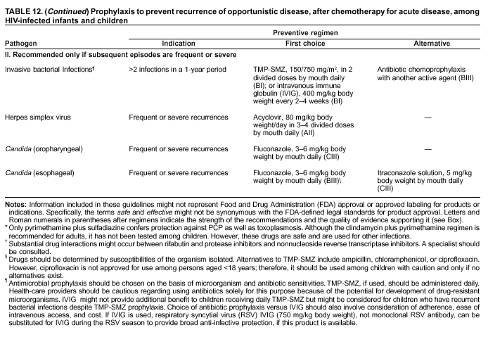 For the same reasons that clarithromycin and azithromycin are the preferred prophylactic agents for adults, they should also be considered for children (AII); oral suspensions of both agents are commercially available in the United States. No liquid formulation of rifabutin suitable for pediatric use is commercially available in the United States. Children with a history of disseminated MAC should be administered lifelong prophylaxis to prevent recurrence (AII). The safety of discontinuing MAC prophylaxis among children whose CD4+ T lymphocyte counts have increased in response to HAART has not been studied. Pregnant Women. Chemoprophylaxis for MAC disease should be administered to pregnant women as is done for other adults and adolescents (AIII). However, because of concerns related to administering drugs during the first trimester of pregnancy, certain health-care providers might choose to withhold prophylaxis during the first trimester. Animal studies and anecdotal evidence of safety among humans indicate that, of the available agents, azithromycin is the drug of choice (BIII) (71). Experience with rifabutin is limited. Clarithromycin has been demonstrated to be a teratogen among animals and should be used with caution during pregnancy (72). For secondary prophylaxis (chronic maintenance therapy), azithromycin plus ethambutol are the preferred drugs (BIII) (71). Bacterial Respiratory InfectionsPreventing Exposure Because Streptococcus pneumoniae and Haemophilus influenzae are common in the community, no effective way exists to reduce exposure to these bacteria. Preventing Disease Adults and adolescents who have a CD4+ T lymphocyte count of >200 cells/µL should be administered a single dose of 23-valent polysaccharide pneumococcal vaccine (PPV) if they have not received this vaccine during the previous five years (BII) (73--77). One randomized placebo-controlled trial of pneumococcal vaccine in Africa paradoxically determined that an increase had occurred in pneumonia among vaccinated subjects (78). However, multiple observational studies in the United States have not identified increased risk associated with vaccination and have identified benefit among this group (73--77). The majority of HIV specialists believe that the potential benefit of pneumococcal vaccination in the United States outweighs the risk. Immunization should also be considered for patients with CD4+ T lymphocyte counts of <200 cells/µL, although clinical evidence has not confirmed efficacy (CIII). Revaccination can be considered for patients who were initially immunized when their CD4+ T lymphocyte counts were <200 cells/µL and whose CD4+ counts have increased to >200 cells/µL in response to HAART (CIII). The recommendation to vaccinate is increasingly pertinent because of the increasing incidence of invasive infections with drug-resistant (including TMP-SMZ--, macrolide-, and ß-lactam--resistant) strains of S. pneumoniae. The duration of the protective effect of primary pneumococcal vaccination is unknown. Periodic revaccination can be considered; an interval of 5 years has been recommended for persons not infected with HIV and also might be appropriate for persons infected with HIV (CIII) (76). However, no evidence confirms clinical benefit from revaccination. Incidence of H. influenzae type B (Hib) infection among adults is low. Therefore, Hib vaccine is not usually recommended for adult use (DIII). TMP-SMZ, when administered daily for PCP prophylaxis, reduces the frequency of bacterial respiratory infections. This should be considered in selecting an agent for PCP prophylaxis (AII). However, indiscriminate use of this drug (when not indicated for PCP prophylaxis or other specific reasons) might promote development of TMP-SMZ-resistant organisms. Thus, TMP-SMZ should not be prescribed solely to prevent bacterial respiratory infection (DIII). Similarly, clarithromycin administered daily and azithromycin administered weekly for MAC prophylaxis might be effective in preventing bacterial respiratory infections; this should be considered in selecting an agent for prophylaxis against MAC disease (BII). However, these drugs should not be prescribed solely for preventing bacterial respiratory infection (DIII). An absolute neutrophil count that is depressed because of HIV disease or drug therapy is associated with an increased risk for bacterial infections, including pneumonia. To reduce the risk for such bacterial infections, health-care providers might consider taking steps to reverse neutropenia, either by stopping myelosuppressive drugs (CII) or by administering granulocyte-colony-stimulating factor (G-CSF) (CII). Preventing Recurrence Clinicians can administer anti-biotic chemoprophylaxis to HIV-infected patients who have frequent recurrences of serious bacterial respiratory infections (CIII). TMP-SMZ, administered for PCP prophylaxis, and clarithromycin or azithromycin, administered for MAC prophylaxis, are appropriate for drug-sensitive organisms. However, health-care providers should be cautious when using antibiotics solely for preventing the recurrence of serious bacterial respiratory infections because of the potential development of drug-resistant microorganisms and drug toxicity. Special Considerations Children. HIV-infected children aged <5 years should be administered Hib vaccine (AII) and pneumococcal conjugate vaccine (PCV) (79--81) (BII) in accordance with the guidelines of the Advisory Committee on Immunization Practices (74,76,79) and the American Academy of Pediatrics (80). Children aged >2 years should also receive 23-valent PPV (BII). Revaccination with a second dose of the 23-valent PPV should usually be administered after 3--5 years to children aged <10 years and after 5 years to children aged >10 years (BIII). To prevent serious bacterial infections among HIV-infected children who have hypogammaglobulinemia (IgG <400 mg/dL), clinicians should use intravenous immune globulin (IVIG) (AI). Respi