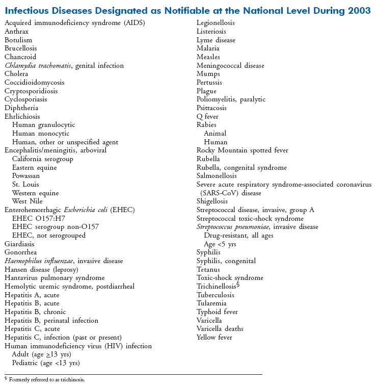 Persons using assistive technology might not be able to fully access information in this file. For assistance, please send e-mail to: mmwrq@cdc.gov. Type 508 Accommodation and the title of the report in the subject line of e-mail. Summary of Notifiable Diseases --- United States, 2003Please note: An erratum has been published for this article. To view the erratum, please click here. Prepared by Division of Public Health Surveillance and Informatics PrefaceThe Summary of Notifiable Diseases --- United States, 2003 contains the official statistics, in tabular and graphic form, for the reported occurrence of nationally notifiable diseases in the United States for 2003. Unless otherwise noted, the data are final totals for 2003 reported as of June 30, 2004. These statistics are collected and compiled from reports sent by state health departments to the National Notifiable Diseases Surveillance System (NNDSS), which is operated by CDC in collaboration with the Council of State and Territorial Epidemiologists (CSTE). The Summary is available at http://www.cdc.gov/mmwr/summary.html. This site also includes publications from past years. The Highlights section presents noteworthy epidemiologic and prevention information for 2003 for selected diseases and additional information to aid in the interpretation of surveillance and disease-trend data. Part 1 contains tables showing incidence data for the nationally notifiable diseases during 2003.* The tables provide the number of cases reported to CDC for 2003, as well as the distribution of cases by month, geographic location, and the patient's demographic characteristics (age, sex, race, and ethnicity). Nationally notifiable diseases that are reportable in <40 states do not appear in these tables. Part 2 contains graphs and maps that depict summary data for certain notifiable diseases described in tabular form in Part 1. Part 3 contains tables that list the number of cases of notifiable diseases reported to CDC since 1970. This section also includes a table enumerating deaths associated with specified notifiable diseases reported to CDC's National Center for Health Statistics (NCHS), during 1996--2001.† The Selected Reading section presents general and disease-specific references for notifiable infectious diseases. These references provide additional information on surveillance and epidemiologic concerns, diagnostic concerns, and disease control activities. BackgroundThe infectious diseases designated as notifiable at the national level during 2003 are listed on page 3. A notifiable disease is one for which regular, frequent, and timely information regarding individual cases is considered necessary for the prevention and control of the disease. This section briefly summarizes the history of the reporting of nationally notifiable diseases in the United States. In 1878, Congress authorized the U.S. Marine Hospital Service (the forerunner of the Public Health Service [PHS]) to collect morbidity reports regarding cholera, smallpox, plague, and yellow fever from U.S. overseas consuls. The intention was to use this information to institute quarantine measures to prevent the introduction and spread of these diseases into the United States. In 1879, a specific Congressional appropriation was made for the collection and publication of reports of these notifiable diseases. Congress expanded the authority for weekly reporting and publication of these reports in 1893 to include data from states and municipal authorities. To increase the uniformity of the data, Congress enacted a law in 1902 directing the Surgeon General to provide forms for the collection and compilation of data and for the publication of reports at the national level. In 1912, in conjunction with PHS, state and territorial health authorities recommended immediate telegraphic reporting of five infectious diseases and the monthly reporting, by letter, of 10 additional diseases. The first annual summary of The Notifiable Diseases in 1912 included reports of 10 diseases from 19 states, the District of Columbia, and Hawaii. By 1928, all states, the District of Columbia, Hawaii, and Puerto Rico were participating in national reporting of 29 specified diseases. At their annual meeting in 1950, state and territorial health officers authorized CSTE to determine which diseases should be reported to PHS. In 1961, CDC assumed responsibility for collecting and publishing data concerning nationally notifiable diseases. The list of nationally notifiable diseases is revised periodically. For example, a disease might be added to the list as a new pathogen emerges, or a disease might be deleted as its incidence declines. Public health officials at state health departments and CDC continue to collaborate in determining which diseases should be nationally notifiable. CSTE, with input from CDC, makes recommendations annually for additions and deletions. Although disease reporting is mandated by legislation or regulation at the state and local levels, state reporting to CDC is voluntary. Thus, the list of diseases considered notifiable varies slightly by state. All states report the internationally quarantinable diseases (i.e., cholera, plague, and yellow fever) in compliance with the World Health Organization's International Health Regulations. * Because no cases of anthrax, Powassan encephalitis/meningitis, western equine encephalitis, paralytic poliomyelitis, or yellow fever were reported in the United States during 2003, these diseases do not appear in the tables in Part I. For certain other nationally notifiable diseases, incidence data were reported to CDC but are not included in the tables or graphs of this Summary. Data on chronic hepatitis B and hepatitis C virus infection (past or present) are undergoing data-quality review. Data on ehrlichiosis attributable to other or unspecified agents are being withheld from publication pending the outcome of discussions about the reclassification of certain Ehrlichi