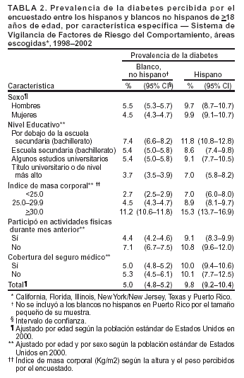 Persons using assistive technology might not be able to fully access information in this file. For assistance, please send e-mail to: mmwrq@cdc.gov. Type 508 Accommodation and the title of the report in the subject line of e-mail. Prevalencia de la diabetes entre hispanos --- Areas Escogidas, 1998--2002La diabetes afecta a los hispanos de manera desproporcionada en los Estados Unidos (1). Sin embargo, la población hispana está compuesta por subpoblaciones culturalmente distintas que tienden a concentrarse por región (2) y la prevalencia de la diabetes puede variar en estas subpoblaciones (3). Los CDC analizaron los datos provenientes de las encuestas del Sistema de Vigilancia de Factores de Riesgo del Comportamiento (BRFSS, por sus siglas en inglés) a fin de estimar la prevalencia de la diabetes entre adultos hispanos y blancos no hispanos que residen en seis estados y entre los hispanos en Puerto Rico. Las disparidades fueron evaluadas por región geográfica. Este informe resume los hallazgos de dicho análisis, el cual indica que, en los Estados Unidos, la prevalencia de la diabetes es más alta entre los hispanos que entre los blancos no hispanos y que la prevalencia de la diabetes entre hispanos varía según la ubicación geográfica. Los hallazgos hacen hincapié en la necesidad de prestar atención a los hispanos y a otras poblaciones con una prevalencia más alta a fin de eliminar las disparidades raciales y étnicas relacionadas con la diabetes. BRFSS realiza encuestas telefónicas de marcación aleatoria, a nivel estatal, en la población civil no institucionalizada de >18 años de edad en los 50 estados, el Distrito de Columbia, Puerto Rico y otros territorios estadounidenses. Se consideró que los encuestados tenían diabetes si contestaban "sí" a la pregunta "¿Alguna vez le ha dicho un médico que usted tiene diabetes?". A las mujeres a quienes se les había dicho que tenían diabetes, pero solamente durante el embarazo, fueron clasificadas en el grupo de los que no tiene diabetes. A todos los encuestados que manifestaron tener origen hispano se les consideró hispanos, independientemente de la raza; a todos los encuestados que dijeron ser blancos, pero no de origen hispano, se les consideró blancos no hispanos. Debido al número limitado de hispanos en las encuestas anuales de BRFSS, se agruparon los datos de 1998--2002 correspondientes a seis áreas geográficas con las proporciones más grandes de hispanos: California, Florida, Illinois, Nueva York/Nueva Jersey (estados vecinos unidos para tener una muestra más grande), Texas y Puerto Rico. Se ponderaron los datos para que reflejaran la edad, el sexo y la distribución racial y étnica de la población no institucionalizada de esas seis áreas. Las entrevistas se hicieron en inglés y en español; sin embargo, no se recogieron datos sobre el idioma utilizado. Se estimó la prevalencia de la diabetes entre los hispanos y los blancos no hispanos en cada área por edad, sexo, nivel de educación, índice de masa corporal a partir del peso y la altura (IMC = kg/m2) que especificaron, cobertura de seguro médico y realización de actividades físicas fuera del trabajo durante el mes anterior a la encuesta. Los encuestados con un IMC igual a 25.0-29.9 fueron clasificados como personas con sobrepeso y los que tenían un IMC >30.0, como obesos. Los datos fueron ajustados por edad y sexo mediante el método directo que utiliza la población estándar de los Estados Unidos y se calcularon intervalos de confianza (IC) del 95%; se realizó una `prueba t' para determinar si las diferencias en la prevalencia de la diabetes entre poblaciones en cada área eran estadísticamente significativas. No se compararon las prevalencias correspondientes a los hispanos y a los blancos no hispanos en Puerto Rico por el tamaño limitado de la muestra de blancos no hispanos. La tasa mediana de respuestas en los seis estados y en Puerto Rico fue de 52.2% en 1998 (intervalo: 32.5%--76.7%), 45.0% en 1999 (intervalo: 36.2%--69.5%), 41.5% en 2000 (intervalo: 28.8%--65.3%), 39.7% en 2001 (intervalo: 33.3%--81.5%) y 45.2% en 2002 (intervalo: 42.2%--75.2%). En general, al 7.4% de los adultos hispanos en las seis áreas, un médico les había dicho que tenían diabetes; la prevalencia osciló entre 6.2% en Illinois y Nueva York/Nueva Jersey y 9.3% en Puerto Rico (Tabla 1). Tanto en los adultos hispanos como en los blancos no hispanos, la prevalencia de la diabetes aumentó con la edad (p<0.001; `prueba t' de tendencia). La prevalencia de diabetes total y la específica por edad fueron significativamente más altas entre los hispanos que entre los blancos no hispanos en California (7.8% frente a 5.1%; p<0.01) y Texas (7.1% frente a 5.7%; p<0.01) (Tabla 1). En otras áreas, la prevalencia de la diabetes fue significativamente más alta entre hispanos solamente en el caso de las edades de 45 a 54 años en Illinois (15.9% frente a 4.6%; p<0.01), 45-64 años en Nueva York/Nueva Jersey (10.5% frente a 4.4% entre los de 45-54 años y 15.9% frente a 9.8% entre aquellos con 55-64 años de edad; p<0.05) y entre aquellos con >65 años de edad en Florida (20.6% frente a 12.2%; p<0.001) (Tabla 1). Entre los hispanos en Puerto Rico, la prevalencia de la diabetes general y la específica por edad fueron significativamente más altas que entre los blancos no hispanos en las otras cinco áreas (9.4% frente a 5.1% en California, 5.6% en Nueva York/Nueva Jersey, 5.7% en Texas, 6.0% en Illinois y 6.6% en Florida; p<0.0001) (Tabla 1). En general, la prevalencia de diabetes la ajustada por edad entre adultos hispanos fue casi dos veces la de los adultos blancos no hispanos (9.8% frente a 5.0%) (Tabla 2). Entre los hispanos, la prevalencia entre los hombres y entre las mujeres fue similar (9.7% frente a 9.9%), sin embargo, entre blancos no hispanos, la prevalencia fue significativamente más alta entre los hombres que entre las mujeres (5.5% frente a 4.5%; p<0.0001) (Tabla