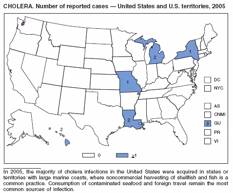 In 2005, the largest number of laboratory-confirmed cases of toxigenic Vibrio cholerae O1 infection were reported since 1998. The average annual number of cases of cholera reported during 1995--2000 and 2001--2005 was 10.2 and 4.6 per year, respectively (1). None of the patients hospitalized for cholera died. Approximately 36% of cases were acquired outside the United States, 36% were attributable to consumption of domestic seafood, and for 27% (residents of Guam),