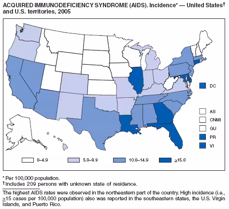 At the end of 2005, in the 37 areas (33 states, American Samoa, Guam, the Commonwealth of the Northern Mariana Islands, and the U.S. Virgin Islands) that have had laws or regulations since 2001 requiring confidential name-based reporting for children aged <13 years with confirmed HIV infection, an estimated 2,460 children were living with HIV infection. Estimated prevalence of HIV infection (not AIDS) in this group was 7.4 per 100,000 population (1).