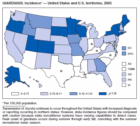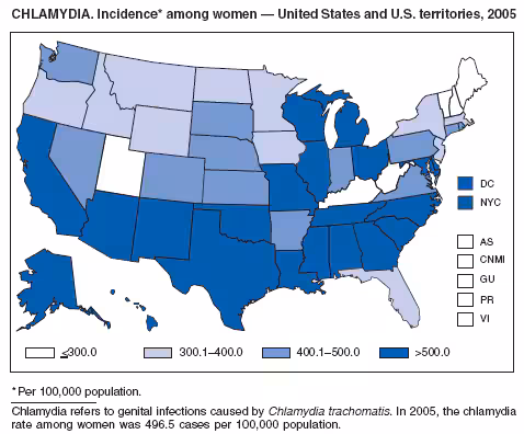 Population estimates for the states are from the NCHS bridged-race estimates of the July 1, 2004, U.S. resident population from the vintage 2004 postcensal series by year, county, age, sex, race, and Hispanic origin, prepared under a collaborative arrangement with the U.S. Census Bureau. This data set was released on September 9, 2005, and is available at http://www.cdc.gov/nchs/about/major/dvs/popbridge/popbridge.htm. Populations for territories are 2004 estimates from the U.S. Census Bureau International Data Base Data Access--Display Mode, available at http://www.census.gov/ipc/www/idbprint.html. The choice of population denominators for incidence reported in the MMWR is based on 1) the availability of census population data at the time of preparation for publication and 2) the desire for consistent use of the same population data to compute incidence reported by different CDC programs. Incidence in the Summary is calculated as the number of reported cases for each disease or condition divided by either the U.S. resident population for the specified demographic population or the total U.S. residential population, multiplied by 100,000. When a nationally notifiable disease is associated with a specific age restriction, the same age restriction is applied to the population in the denominator of the incidence calculation. In addition, population data from states in which the disease or condition was not notifiable or was not available were excluded from incidence calculations. Unless otherwise stated, disease totals for the United States do not include data for American Samoa, Guam, Puerto Rico, the Commonwealth of the Northern Mariana Islands, or the U.S. Virgin Islands.