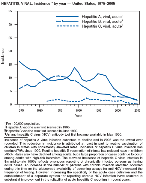 Since 1990, the number of acute hepatitis B cases has declined 80%; the rate reported in 2005 was 1.8 per 100,000 population. This steady decline has coincided with the implementation of a national strategy to achieve the elimination of hepatitis B (1). The primary elements of this strategy are the screening of all pregnant women for hepatitis B virus (HBV) infection with the provision of postexposure prophylaxis to infants born to infected women; routine vaccination of all infants and children aged <19 years; and vaccination of others at increased risk for hepatitis B (e.g., health-care workers, men who have sex with men [MSM], injection-drug users [IDUs], and household and sex contacts of persons with chronic HBV infection).