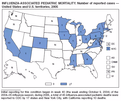 During 2005, a total of 45 influenza-associated pediatric deaths were reported to CDC by 17 states and New York City, with California reporting 10 deaths. The median age of the deceased children was 5 years (range: 23 days--17 years); 21 (47%) were aged <5 years. Although the majority of deaths occurred in a hospital setting, six children (13%) died outside a hospital setting. Of the 45 children, 31 (69%) had an underlying or chronic condition, and 14 (31%) were previously healthy. Chronic conditions included seizure disorder, prematurity, neurologic disease, neuromuscular disorders, chronic pulmonary disease, immunosuppression, congenital anomalies, and developmental delay. Bacterial coinfections were confirmed in four children. The current recommendations of the Advisory Committee on Immunization Practices (7) highlight the importance of administering 2 doses of influenza vaccine for previously unvaccinated children aged 6 months--<9 years. Continued surveillance of severe influenza-related mortality is important to monitor the impact of influenza and the possible effects of interventions, including influenza vaccination in children.