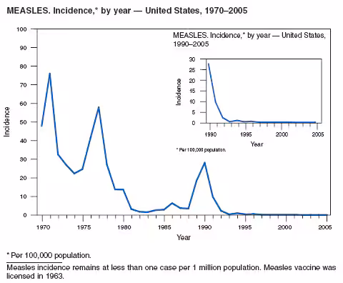 Papania M, Hinman A, Katz S, Orenstein W, McCauley M, eds. Progress toward measles elimination---absence of measles as an endemic disease in the United States. J Infect Dis 2004;189(Suppl 1):S1--257.