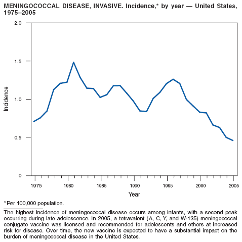 Rosenstein NE, Perkins BA, Stephens DS, et al. The changing epidemiology of meningococcal disease in the United States, 1992--1996. J Infect Dis 1999;180:1894--901.
