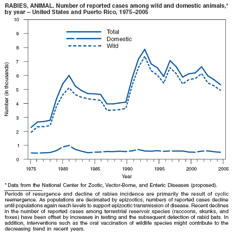 Krebs JW, Mandel EJ, Swerdlow DL, Rupprecht CE. Rabies surveillance in the United States during 2004. J Am Vet Med Assoc 2005;227:1912--25.