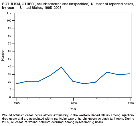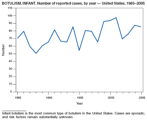 Botulism is a severe paralytic illness caused by the toxins of Clostridium botulinum. Exposure to toxin can occur by ingestion (foodborne botulism) or by in situ production from C. botulinum colonization of a wound (wound botulism) or the gastrointestinal tract (infant botulism and adult intestinal colonization botulism) (1). In addition to the National Notifiable Diseases Surveillance System, CDC maintains intensive surveillance for cases of botulism in the United States. In 2005, cases were attributed to foodborne botulism, wound botulism, infant botulism, and intestinal colonization (2).