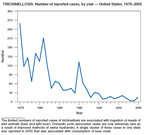 Moorhead A, Grunenwald PE, Dietz VJ, Schantz PM. Trichinellosis in the United States, 1991--1996: declining but not gone. Am J Trop Med Hyg 1999;60:66--9.