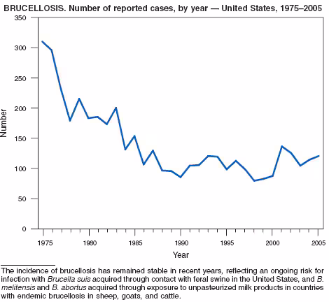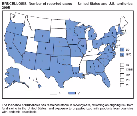 In 2005, three cattle herds in two states, and two swine herds in two states were reported by the U.S. Department of Agriculture (USDA) to be affected by brucellosis. Overall, 48 states remain designated free of cattle brucellosis by USDA (1). Brucella abortus remains enzootic in elk and bison in the greater Yellowstone National Park area, and Brucella suis is enzootic in feral swine in the southeast. Hunters exposed to these animals might be at increased risk for infection. Human cases also can occur among returned travelers or immigrants from countries with endemic brucellosis and are associated with consumption of unpasteurized milk or soft cheeses. Pathogenic Brucella species are considered category B biologic threat agents because of a high potential for aerosol transmission (2). For the same reason, biosafety level 3 practices, containment, and equipment are recommended for laboratory manipulation of isolates (3).
