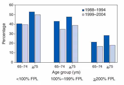 Persons using assistive technology might not be able to fully access information in this file. For assistance, please send e-mail to: mmwrq@cdc.gov. Type 508 Accommodation and the title of the report in the subject line of e-mail. QuickStats: Prevalence of Complete Tooth Loss Among Older Adults,* By Age Group and Federal Poverty Level (FPL)† --- National Health and Nutrition Examination Survey, 1988--1994 and 1999--2004
