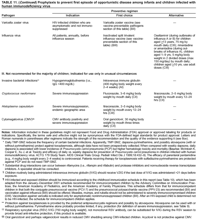 Persons using assistive technology might not be able to fully access information in this file. For assistance, please send e-mail to: mmwrq@cdc.gov. Type 508 Accommodation and the title of the report in the subject line of e-mail. Guidelines for Preventing Opportunistic Infections Among HIV-Infected Persons --- 2002Recommendations of the U.S. Public Health Service and the Infectious Diseases Society of America*Note: Information included in these guidelines might not represent Food and Drug Administration (FDA) approval or approved labeling for products or indications. Specifically, the terms safe and effective might not be synonymous with the FDA-defined legal standards for product approval. Prepared by The material in this report was prepared for publication by the National Center for HIV, STD, and TB Prevention, Harold W. Jaffe, M.D., Acting Director, the Division of HIV/AIDS Prevention --- Surveillance and Epidemiology, Robert S. Janssen, M.D., Director; and the National Center for Infectious Diseases, James M. Hughes, M.D., Director. SummaryIn 1995, the U.S. Public Health Service (USPHS) and the Infectious Diseases Society of America (IDSA) developed guidelines for preventing opportunistic infections (OIs) among persons infected with human immunodeficiency virus (HIV); these guidelines were updated in 1997 and 1999. This fourth edition of the guidelines, made available on the Internet in 2001, is intended for clinicians and other health-care providers who care for HIV-infected persons. The goal of these guidelines is to provide evidence-based guidelines for preventing OIs among HIV-infected adults and adolescents, including pregnant women, and HIV-exposed or infected children. Nineteen OIs, or groups of OIs, are addressed, and recommendations are included for preventing exposure to opportunistic pathogens, preventing first episodes of disease by chemoprophylaxis or vaccination (primary prophylaxis), and preventing disease recurrence (secondary prophylaxis). Major changes since the last edition of the guidelines include 1) updated recommendations for discontinuing primary and secondary OI prophylaxis among persons whose CD4+ T lymphocyte counts have increased in response to antiretroviral therapy; 2) emphasis on screening all HIV-infected persons for infection with hepatitis C virus; 3) new information regarding transmission of human herpesvirus 8 infection; 4) new information regarding drug interactions, chiefly related to rifamycins and antiretroviral drugs; and 5) revised recommendations for immunizing HIV-infected adults and adolescents and HIV-exposed or infected children. IntroductionIn 1995, the U.S. Public Health Service (USPHS) and the Infectious Diseases Society of America (IDSA) developed guidelines for preventing opportunistic infections (OIs) among persons infected with human immunodeficiency virus (HIV) (1--3). These guidelines, which are intended for clinicians and health-care providers and their HIV-infected patients, were revised in 1997 (4) and again in 1999 (5), and have been published in MMWR (1,4,5), Clinical Infectious Diseases (2,6,7), Annals of Internal Medicine (3,8), American Family Physician (9,10), and Pediatrics (11); accompanying editorials have appeared in JAMA (12,13). Response to these guidelines (e.g., a substantial number of requests for reprints, website contacts, and observations from health-care providers) demonstrates that they have served as a valuable reference for HIV health-care providers. Because the 1995, 1997, and 1999 guidelines included ratings indicating the strength of each recommendation and the quality of supporting evidence, readers have been able to assess the relative importance of each recommendation. Since acquired immunodeficiency syndrome (AIDS) was first recognized 20 years ago, remarkable progress has been made in improving the quality and duration of life for HIV-infected persons in the industrialized world. During the first decade of the epidemic, this improvement occurred because of improved recognition of opportunistic disease processes, improved therapy for acute and chronic complications, and introduction of chemoprophylaxis against key opportunistic pathogens. The second decade of the epidemic has witnessed extraordinary progress in developing highly active antiretroviral therapies (HAART) as well as continuing progress in preventing and treating OIs. HAART has reduced the incidence of OIs and extended life substantially (14--16). HAART is the most effective approach to preventing OIs and should be considered for all HIV-infected persons who qualify for such therapy (14--16). However, certain patients are not ready or able to take HAART, and others have tried HAART regimens but therapy failed. Such patients will benefit from prophylaxis against OIs (15). In addition, prophylaxis against specific OIs continues to provide survival benefits even among persons who are receiving HAART (15). Clearly, since HAART was introduced in the United States in 1995, chemoprophylaxis for OIs need not be lifelong. Antiretroviral therapy can restore immune function. The period of susceptibility to opportunistic processes continues to be accurately indicated by CD4+ T lymphocyte counts for patients who are receiving HAART. Thus, a strategy of stopping primary or secondary prophylaxis for certain patients whose immunity has improved as a consequence of HAART is logical. Stopping prophylactic regimens can simplify treatment, reduce toxicity and drug interactions, lower cost of care, and potentially facilitate adherence to antiretroviral regimens. In 1999, the USPHS/IDSA guidelines reported that stopping primary or secondary prophylaxis for certain pathogens was safe if HAART has led to an increase in CD4+ T lymphocyte counts above specified threshold levels. Recommendations were made for only those pathogens for which adequate clinical data were available. Data generated since 1999 continue to support these recommendations and allow additi
