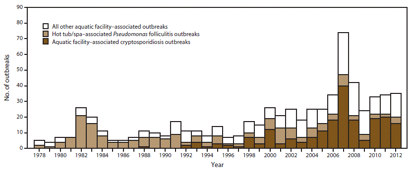 Since 1978, CDC has tracked aquatic facility–associated outbreaks via the Waterborne Disease and Outbreak Surveillance System (WBDOSS) (http://www.cdc.gov/healthywater/surveillance/rec-water-surveillance-reports.html). An aquatic facility–associated outbreak is defined as the occurrence of similar illness in two or more persons, epidemiologically linked by location and time of exposure to recreational water or to recreational water–associated chemicals volatilized or aerosolized into the air surrounding the water. During 1978–2012, a total of 650 aquatic facility–associated outbreaks were reported to CDC (Figure). Although these reported data likely represent only a fraction of outbreaks that occurred,¶¶ national outbreak data can be used to detect changes in the epidemiology of aquatic facility–associated outbreaks, including novel aquatic venues, emerging infectious pathogens, and the shift to indoor settings. For example, these data indicate that a spike in the incidence of outbreaks of Pseudomonas folliculitis associated with hot tubs/spas occurred in the early 1980s, when hot tubs/spas became popular but before operation and maintenance standards could be established in jurisdictions across the United States. In 1988, the first U.S. aquatic facility–associated outbreak of cryptosporidiosis was detected (6,7). Since then, the annual incidence of such reported outbreaks has increased substantially, and Cryptosporidium, the parasite that causes cryptosporidiosis, has emerged as the leading etiology of reported aquatic facility–associated outbreaks because of its extreme chlorine tolerance (8). Moreover, a focal cryptosporidiosis outbreak associated with one aquatic facility can expand into a community-wide outbreak that is associated with hundreds of aquatic facilities, affects thousands of persons (disproportionately young children), and spreads to other additional settings (e.g., child care facilities) (9). With the proliferation of indoor waterparks in recent years, CDC has increasingly received reports of aquatic facility–associated outbreaks involving indoor settings (8). The largest such outbreak to date, which occurred in Ohio in 2007, affected at least 665 persons and was caused by volatile disinfection by-products called chloramines (10). Dichloramine and trichloramine are created when chlorine oxidizes nitrogenous compounds (e.g., human waste products such as sweat and urine). Unlike monochloramine, which is commonly used to disinfect drinking water, these chloramines can cause ocular and respiratory tract irritation. Limiting the amounts of fresh air introduced and of chloramine-polluted air exhausted, particularly during colder months, increases these health effects.