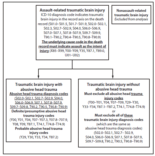 In the MMWR report, “Fatal Abusive Head Trauma Among Children Aged <5 Years — United States, 1999–2014,” multiple errors occurred in the figure on page 507 (corrected text is noted by underline). The top box should have read, “The underlying cause code in the death record must indicate assault as the intent of injury.” The bottom left box should have read, “Abusive head trauma diagnosis codes (S02.0–S02.1, S02.7–S02.9, S04.0, S06.0–S06.9, S07.1, S07.8–S07.9, S09.7–S09.8, T90.2, T90.5, T90.8–T90.9).” The bottom right box should have read, “Must exclude all abusive head trauma injury codes,” and “Must exclude all of these traumatic brain injury diagnosis codes.”