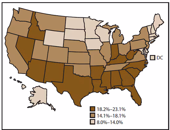 Among adults aged 18–64 years, the median estimated prevalence of unmet health care need because of cost during the preceding 12 months was 15.3% and ranged from 8.0% in North Dakota to 23.1% in Mississippi (Table 1) (Figure 6). The estimated prevalence of unmet health care need because of cost was higher for adults aged 25–44 years (18.9%) than for adults aged 18–24 years (14.4%) and 45–64 years (15.0%) (Figure 7). The estimated prevalence of unmet health care need because of cost was higher among women (19.4%) than men (14.2%). By race/ethnicity, the estimated prevalence of adults reporting unmet health care need because of cost was as follows: 11.3% (non-Hispanic Asian), 13.9% (non-Hispanic white), 14.4% (non-Hispanic other race), 14.9% (non-Hispanic NHPI), 18.4% (non-Hispanic AIAN), 21.0% (non-Hispanic black), 21.2% (non-Hispanic multiple race), and 25.0% (Hispanic). The estimated prevalence of unmet health care need because of cost decreased with increasing level of educational attainment: 29.8% of adults with less than high school education, 18.7% of adults with a high school education, and 12.8% of adults with greater than high school education had unmet health care need because of cost. By marital status, 13.9% of married adults had unmet health care need because of cost, whereas 20.2% of never married adults and 26.2% of previously married (divorced, separated, widowed) adults had unmet health care need because of cost. By employment status, 14.4% of employed adults had unmet health care need because of cost, whereas 20.0% of adults not in the labor market and 31.9% of unemployed adults reported a cost barrier to health care need. Adults with household income <100% of FPL were the most likely to have unmet health care need because of cost (32.9%), compared with adults in other income groups (19.5% and 5.3% among adults with household income ≥100%–≤400% of FPL and >400% of FPL, respectively). The estimated prevalence of unmet health care need because of cost was higher for adults with disabilities (30.8%) than for adults without disabilities (13.7%). Crude state-specific estimates of cost barrier to health care need during the preceding 12 months by sociodemographic characteristics are available (supplemental Table S2 https://stacks.cdc.gov/view/cdc/43255).