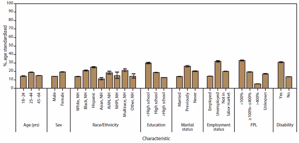 FIGURE 7. Age-standardized* prevalence estimates of cost barrier to health care need during preceding 12 months among adults aged 18–64 years, by sociodemographic characteristics — Behavioral Risk Factor Surveillance System, United States, 2014