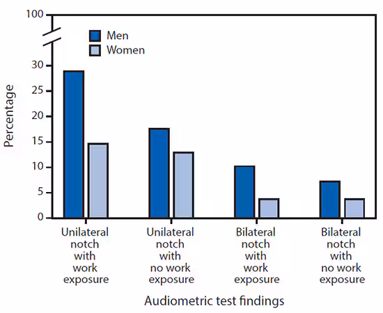 Methods: CDC analyzed the most recent available data collected both by questionnaire and audiometric tests of adult participants aged 20–69 years in the 2011–2012 National Health and Nutrition Examination Survey (NHANES) to determine the presence of audiometric notches indicative of noise-induced hearing loss. Prevalence of both unilateral and bilateral audiometric notches and their association with sociodemographics and self-reported exposure to loud noise were calculated.