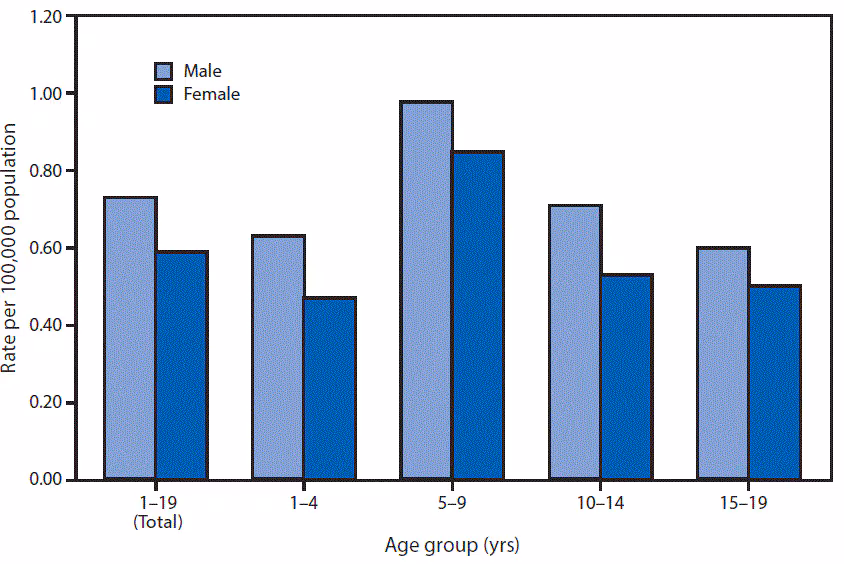The death rate for brain cancer, the most common cancer cause of death for children and teens aged 1–19 years, was 24% higher in males (0.73 per 100,000) than females (0.59) aged 1–19 years during 2013–2015. Death rates were higher for males than females for all age groups, but the difference did not reach statistical significance for the age group 5–9 years. Death rates caused by brain cancer were highest at ages 5–9 years (0.98 for males and 0.85 for females).