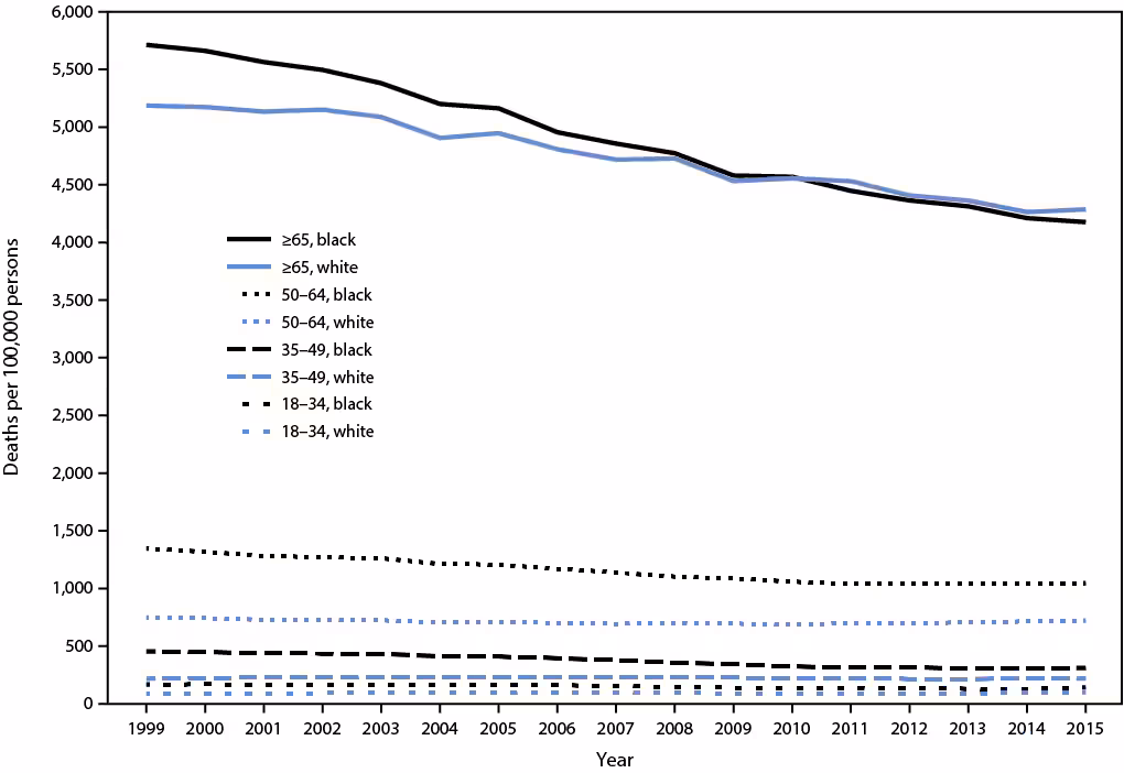 • In the United States, there were fewer age-adjusted deaths per 100,000 during 2015 compared with 1999, with 284 fewer among blacks and 120 fewer among whites.