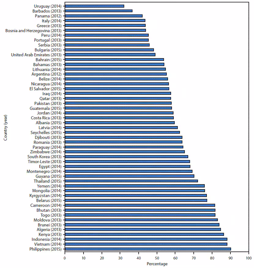 Among the 51 countries in which the desire to quit was assessed among current tobacco smokers, the proportion of students who desired to quit ranged from 32.1% (Uruguay) to 90.2% (Philippines); the proportion of current tobacco smokers who reported a desire to quit exceeded 50% in 40 of those countries (Figure). By WHO region, the proportions ranged from 62.2% (Seychelles) to 86.3% (Kenya) in AFR; 49.1% (United Arab Emirates) to 75.8% (Yemen) in EMR; 43.5% (Italy) to 83.1% (Moldova) in EUR; 32.1% (Uruguay) to 70.1% (Guyana) in AMR; 67.8% (Timor-Leste) to 88.2% (Indonesia) in SEARO; and 66.9% (South Korea) to 90.2% (Philippines) in WPR.
