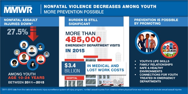 Although the number of young persons treated for nonfatal assault injuries in EDs is declining, and this trend is promising, these injuries remain common and costly. In 2015, approximately 485,610 young persons were treated for assault-related injuries, and associated medical and lost productivity costs were approximately $3.4 billion (1). These injuries continue to occur most often among males and among young adults aged 20–24 years, highlighting the groups that need to be reached with continued and enhanced prevention strategies. Violence among young persons is preventable with the implementation of evidence-based policies and programs that significantly reduce the risk for injuries and associated risk factors. CDC’s A Comprehensive Technical Package for the Prevention of Youth Violence and Associated Risk Behaviors (https://www.cdc.gov/violenceprevention/pdf/yv-technicalpackage.pdf) can help states and communities focus their collaborative action on strategies supported by the best available evidence (2).
